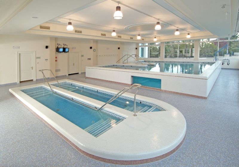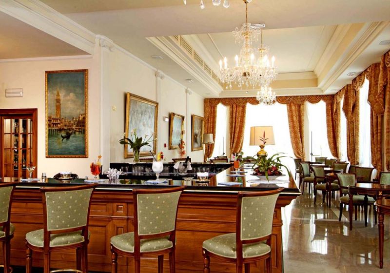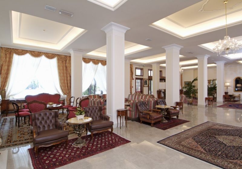 Senior Suite (Номера в новом крыле отеля с панорамным видом. Общая площадь номера 50 м кв. Номера категории Senior Suite расположены на нижних и верхних этажах в центральной колонной части нового крылаотеля и имеют следующую планировку: - с левой стороны от входа гостевой туалетс душевой кабиной - три ступеньки ведут в просторный зал,разделенный на зону гостиной (с удобным диваном,письменным столом и стульями) и спальни с большой кроватью. Ковровое покрытие. TV со спутниковым телевидением, мини бар, столик и кресла, телефон - ванная комната из натурального мрамора с душевой кабинкой и ванной, туалетом, биде, умывальником с большим зеркалом - лоджия, которая выходит на парковую зону отеля с бассейнами и Эуганские Холмы Цветовая гамма: синий, красный, золотистый. )