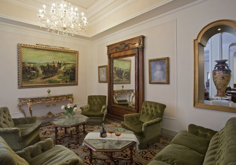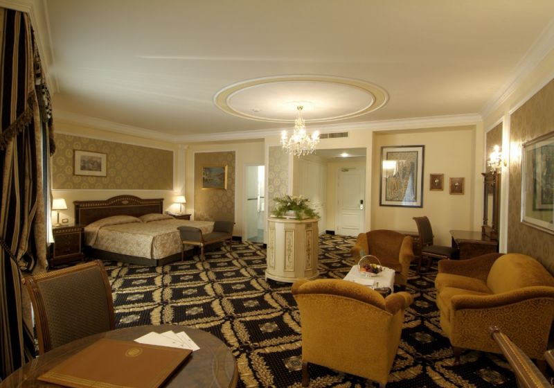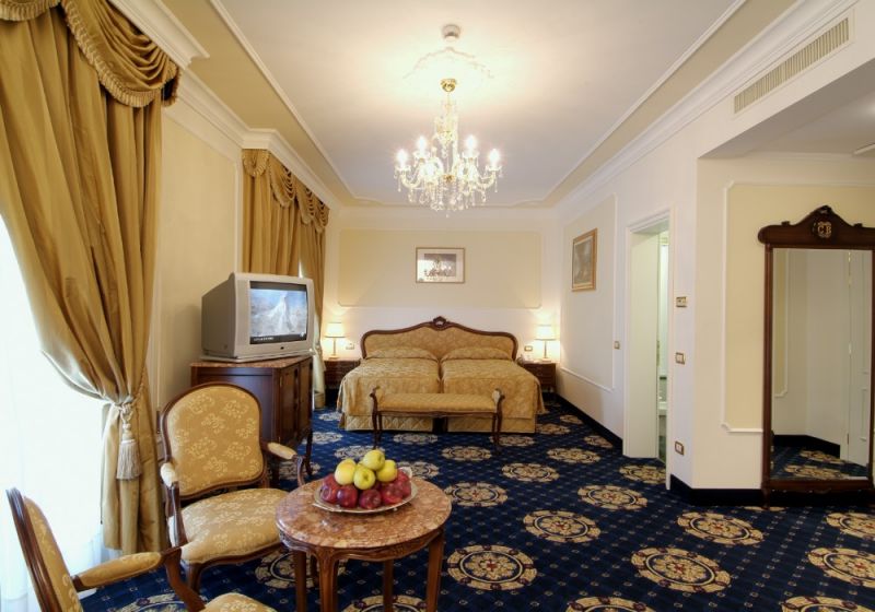 Junior Suite (Номера в новом крыле отеля. Общая площадь номера 37 м кв. Номера категории Junior Suite расположены на нижних и верхних этажах и имеют следующую планировку: - маленький вход - спальня с большой кроватью (пол, покрытый ковром). TV со спутниковым телевидением, мини бар, столик и кресла, телефон - ванная комната из натурального мрамора с душевой кабинкой и ванной, туалетом, биде, умывальником с большим зеркалом - балкон с видом на город Цветовая гамма: синий, красный, золотистый. )