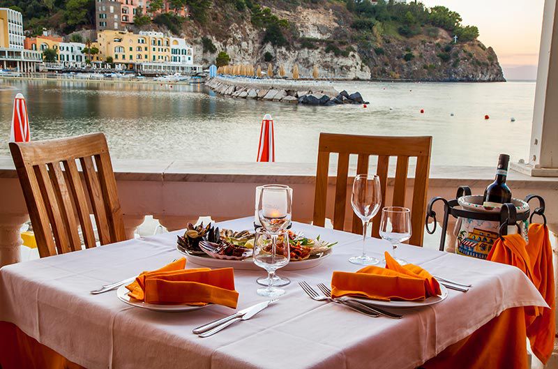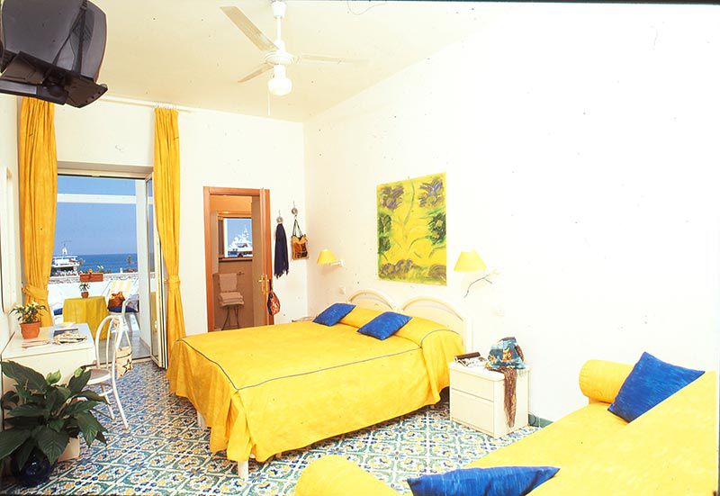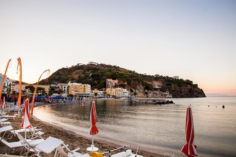 На острове Искья, в 55 км от аэропорта Неаполя (17 км до порта Неаполя + 32 км на пароме от Неаполя до острова Искья); в 6 км от порта г. Искья-Порто, на центральной набережной курорта Лакко-Амено (в 200 м от центральной площади Санта-Реститута) прямо на берегу моря с панорамным видом на местную достопримечательность - живописную скалу в форме гриба (Il Fungo).