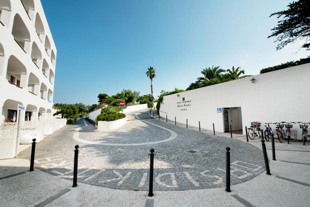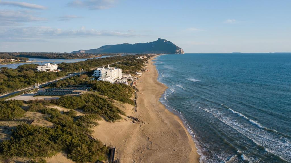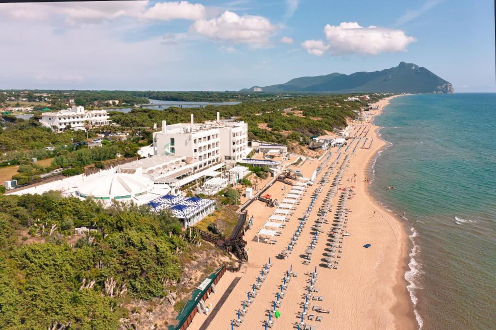 В 1 км от центра курортного города Сабаудия, на узкой песчаной косе среди песчаных дюн между морем и озером, на территории Национального парка Чирчео. Расстояние от аэропорта Рима — 90 км, от аэропорта Неаполя — 149 км. Ближайшая железнодорожная станция Fossanova — 23 км.