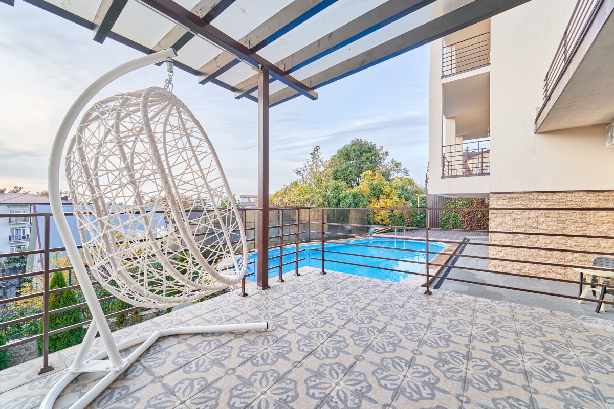 Делюкс — 120 кв. м. Кровати: 1 двуспальная. Кухня-гостиная и спальня. Номер с эксплуатируемой крышей. Дополнительное спальное место: диван раскладной + можно поставить раскладушку.