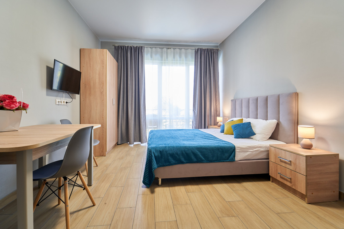 Студия — 25 кв. м. Кровати: 1 двуспальная. Дополнительное спальное место: диван раскладной.