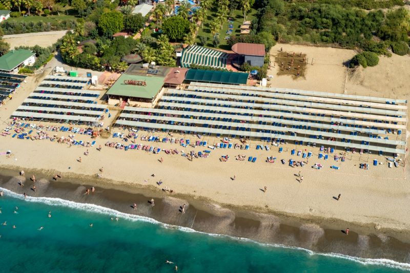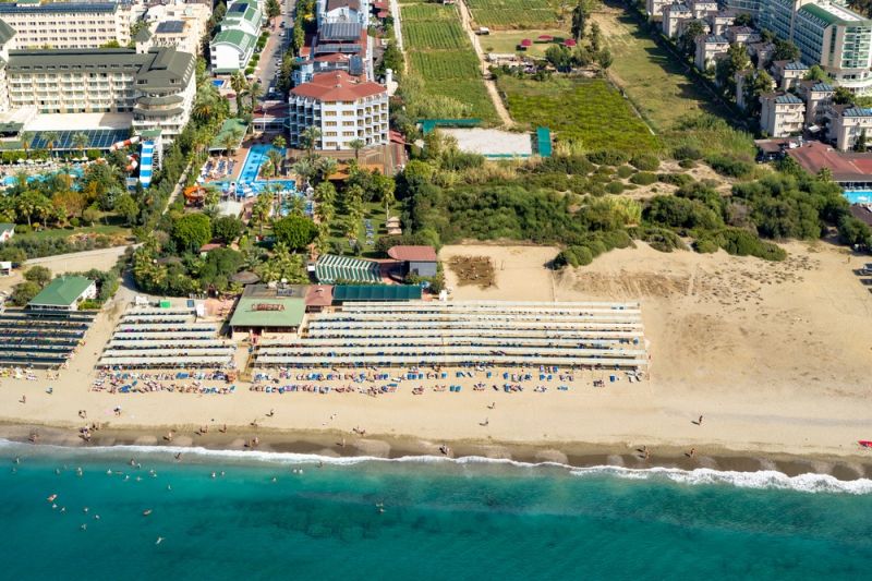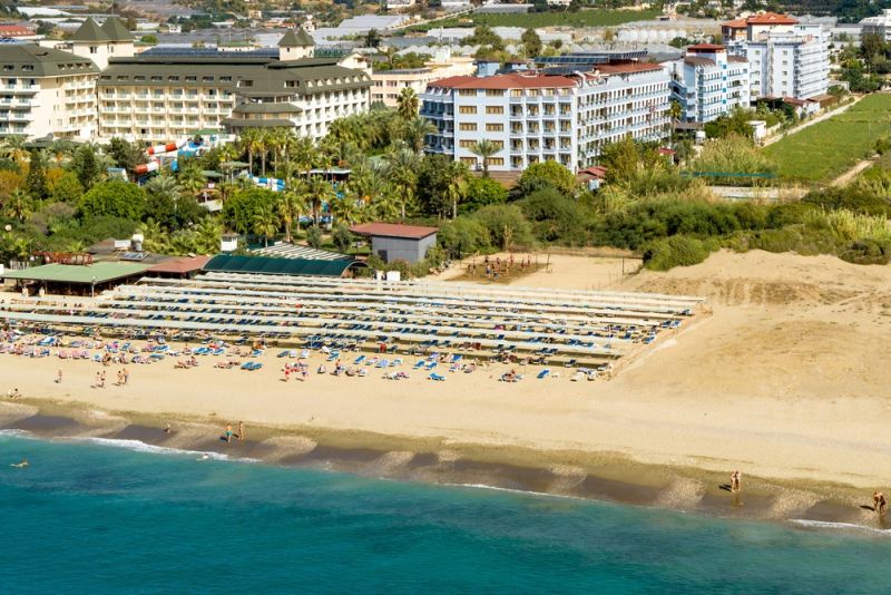 В 110 км от аэропорта г. Анталья, в 12 км от г. Аланья, в 1 км от поселка Конаклы, на берегу моря