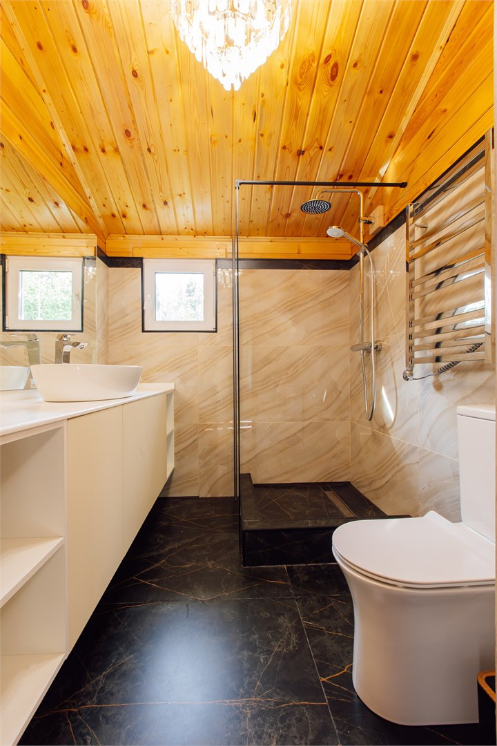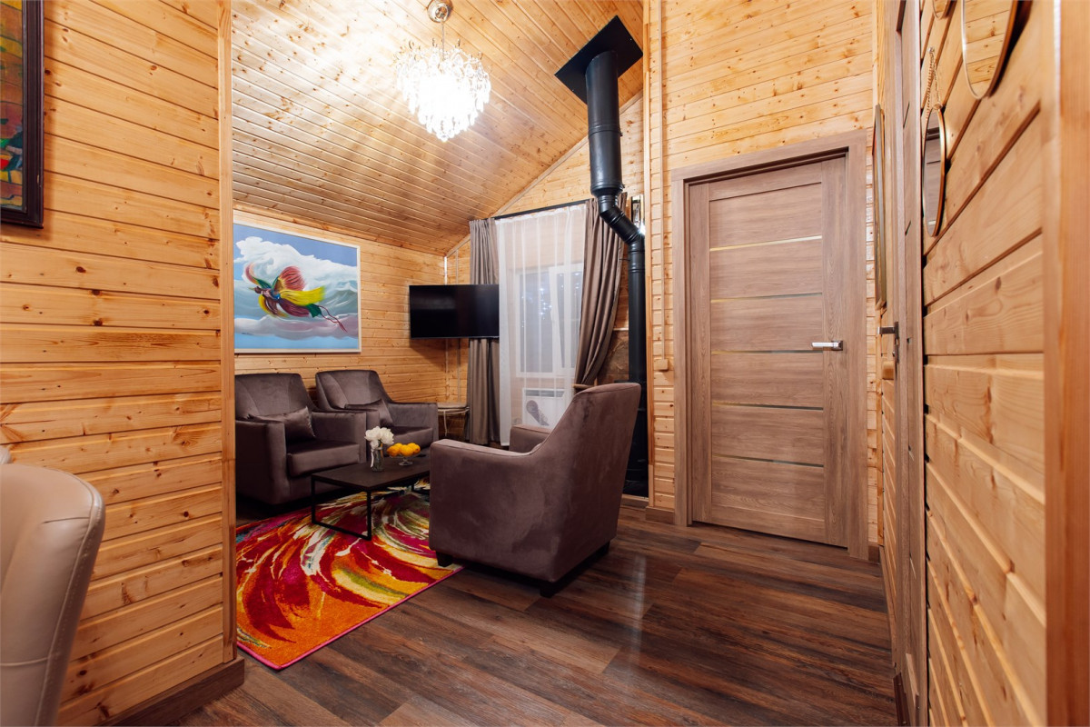 Дом Де Люкс из бруса с купелью на дровах (DE LUXE HOUSE MADE OF TIMBER with a wood-burning font): 170 кв. м. Комнаты в номере: 3 спальни, Столовая, Гостиная. Кровати: 1 двуспальная, 2 двуспальные