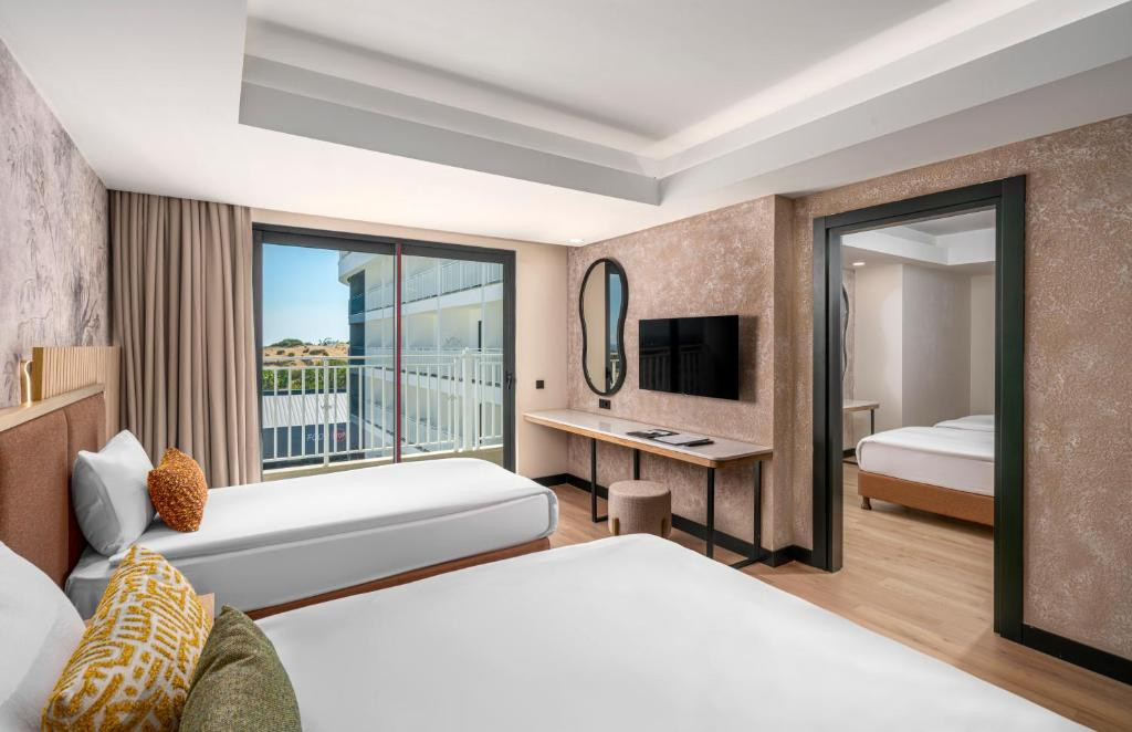 Отель новый, современный интерьер, относительно новая мебель и комнаты хорошие. Русских практически нет, одни европейцы. Территория очень маленькая, отель находится где-то на отшибе, далеко от цивилизации. Еда однообразная, каждый день одно и тоже практически, алкоголь на троечку, один плюс много всяких десертов, тортов. До моря идти минут 15, есть автобус который ходит до 6 вечера, водитель очень добрый ( ещё один плюс). Тур оператор говорил, что якобы пляж только для туристов, по итогу там после 6 вечера оказывается тусуются местные толпами и семьями. В отеле ужасно скучно, два раза только были «дискотеки», контингент такой же, либо только русские могут отжигать. Ещё одну звезду можно поставить за персонал, на ресепшене девочки молодые, вежливые и всегда приветливы, быстро заселили, официанты молодцы,постоянно на ногах, бегали за всеми. Кто нравился нам, оставляли чаевые)) В общем, отель только для скучных артистократов, денег своих явно не стоит, максимум за 160к можно съездить сюда. В след раз не приехала бы)