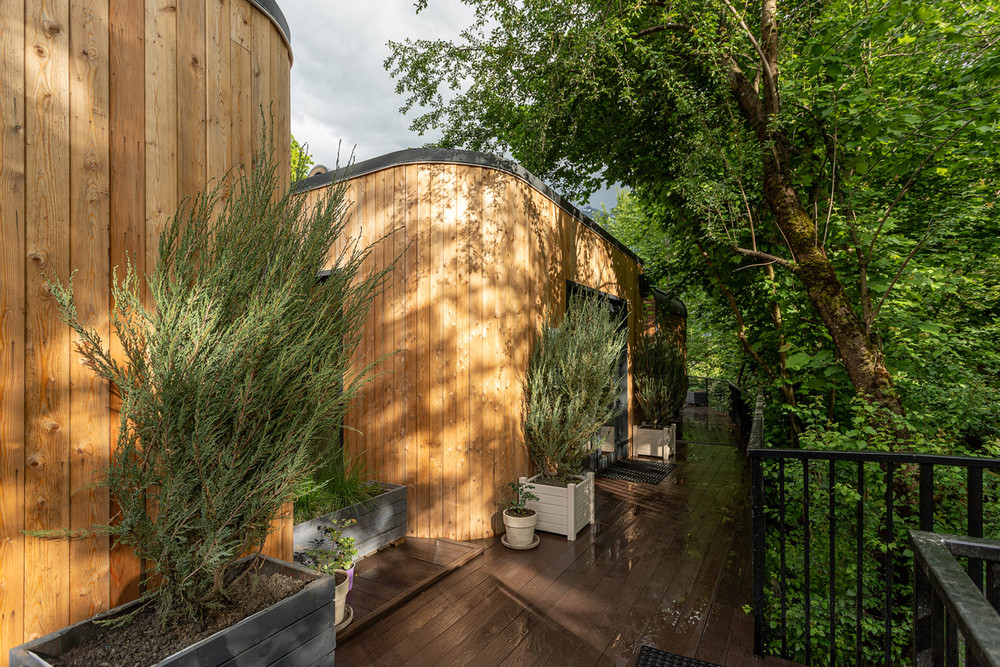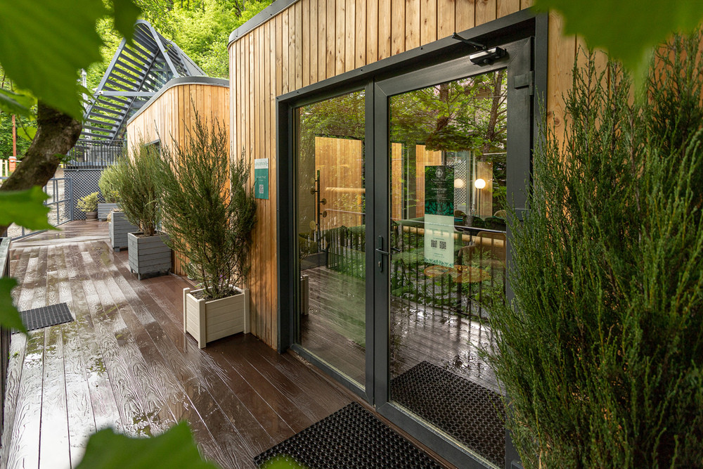 Бунгало с купелью — 20 кв. м. Вид из номера: на горы. Количество комнат: спальня + гостиная. Тип кроватей (основные места): двуспальная. Деревянная, подогреваемая при необходимости купель на собственной террасе. Дополнительное место: диван