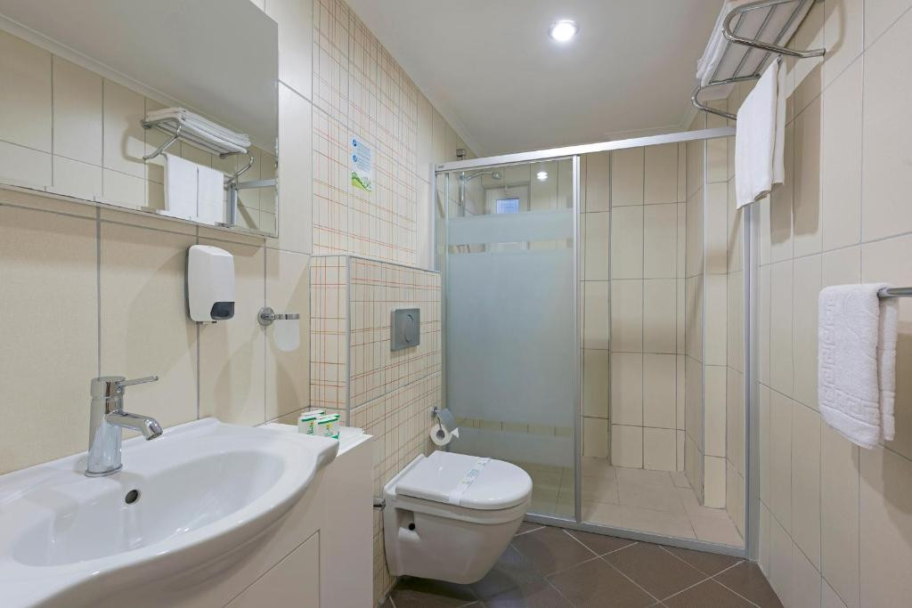 Хороший отель для своей стоимости. Теплое чистое море и мелкий песок очень понравилось. Из воды не хотелось выходить. На пляже тенты, а не зонтики. Лежали и матрасы бесплатно. На пляже есть кафе, в котором можно пообедать с 12-00 и не ходить в главный ресторан. Вообще поесть можно в 5 разных местах целый день)) И попить тоже. В определенные часы мороженое возле одного из бассейнов (всего их 4 включая детский). Несмотря на большое количество людей лежаки были всегда и возле бассейна, и на пляже. Из-за расположения корпусов не замечаешь, что много народа. Это видно только в столовой на ужине, один раз не было свободного стола, пришлось ждать. Из-за ограничений еду накладывает персонал, поэтому были очереди к определенным видам еды. Нужно только говорить, что положить в тарелку, и хоть "чуть-чуть" они уже выучили, но накладывают все равно много)) Но в общем еды много, хотя на четвертый-пятый день она кажется однообразной. Территория большая, зеленая, ухоженная. Уборка номера, постельного и смена полотенец каждый день. Есть сауна, хамам бесплатно. Массаж платно - 18$, но если поторговаться, можно скинуть, и если несколько сеансов, то тоже делают скидку. Аренда детской коляски - 10 евро. Вайфай бесплатный на ресепшене, возле главного бассейна и территории сауны. В номерах вайфая нет, даже платного. Есть экскурсии от гида, но через дорогу в два раза дешевле (правда по качеству не знаю). Рядом есть вещевой рынок - все бренды там)) Телевидение - много каналов на немецком. На русском 2 канала - 1 и Россия, несколько на турецком. Анимация вечером - детская и взрослая с амфитеатра перетекающая к главному бассейну в бар. Днем активности возле бассейна. Есть детский клуб для детей днем, в котором они делают какие-то поделки и вечером на анимации получают грамоты и подарки. Мы были с ребенком 3 года, находили чем развлечься и отдохнуть, но основное время проводили на море, в бассейне ни разу не плавали. Впечатления и воспоминания от отдыха приятные.