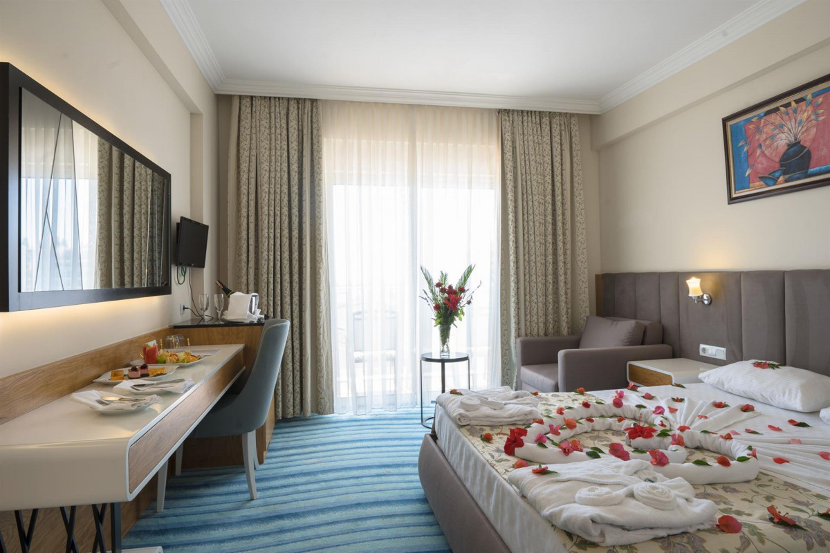 Были тут в сентябре 2024г Из плюсов - море в 2х минутах, самая дешевая цена ( из Москвы 2 взр и реб 11лет 180т за 7 ночей) Нужно понимать какие деньги такой и сервис. Что тут хотеть, если сейчас средняя цена на 2чел в хороший отель 250-300т 1.Номера грязные.Из ежедневной уборки - смена мусорки и полотенец. И все! Мы подходили просили убраться: на ресепшен в телефоне переводчик на турецком попросить убраться- уберут и заменят белье без проблем. 2. Анимации по вечерам раза 4 была : турецкая ночь скромный концерт 30 мин. Миссис и мистер отель 2 дня. Скучно конечно. Ни дискотеки ни даже фоновой музыки за ужином. Были до этого в четверке, там было шикарно в этом плане. 3. Отель для спокойного пенсионерского отдыха- контингент 40-70 лет. Немцы, турки и немного русских. Мы спасались экскурсиями ( брали через ВК , мониторила у местных на улице и нашего гида ,тут самые выгодные цены. 4. Еда средняя. Много рыбы кстати.мясо курица индейка и говядина кости тушенные в основном( у нас такое только на суп идет) а тут деликатес. Если рано выезжаете завтрак с собой в ланч боксах не дают- ответ у нас нет контейнеров. Так что берите с собой. 5. Итого: отель тянет на 3 звезды по номерам и сервису, еда средняя- не голодали. За эти деньги море в доступе мы получили и на экскурсии поездили !