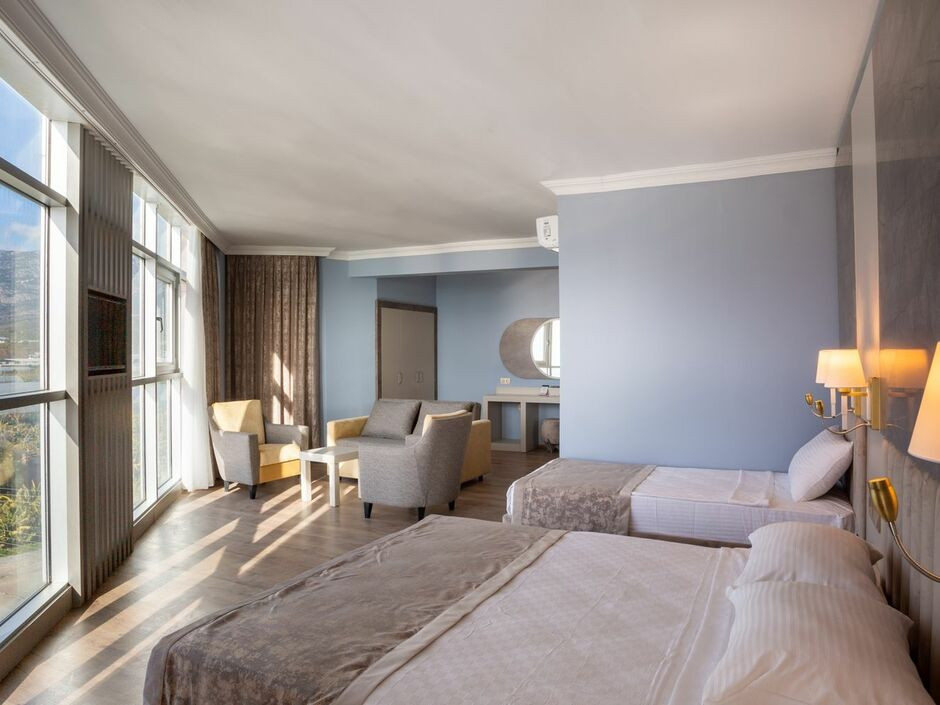 Отдыхали в данном отеле с 17 по 24 сентября 2025г. Выбрали его по положительным отзывам и рекомендации турфирмы. Высоких ожиданий не было,поэтому считаем,что отдых удался, соотношение цена/качество нормальное. Не стоит ожидать,что вы едете в крутую 5*-ку,это не так. Нужно понимать,что отель постройки 90-х годов,хоть и прошёл недавно реставрацию. Реставрация номеров слабенькая- всё новое,но какое-то корявое : у нас в номере криво висели зеркало,телевизор,лампа,в некоторых местах торчала монтажная пена,криво собран шкаф и дверки постоянно "гуляли",в ванной комнате деревянный наличник от двери заканчивался в душевой и постоянно был мокрый,от чего имел уже черные следы разложения. Но на эти мелочи можно закрыть глаза и не портить себе отдых, если не сравнивать с более дорогими пятёрками. Убирались в номере каждый день, полотенца меняли часто и без доплаты,меняли даже пляжные полотенца. Мы с мужем ездили в годовщину свадьбы,о чём указали заранее и нам в номере приготовили презент в виде бутылочки вина и фруктов,что тоже приятно. Звукоизоляция в номерах нормальная,соседей не слышали. По еде претензий нет- всегда всё было вкусно,голодным не останешься,на ужин всегда есть рыба,но опять же- не стоит ожидать каких-то изысков,крабов,кальмаров,устриц - такого в этой пятёрке нет. Обед всегда пропускали,т.к.были в это время на пляже. На пляже так же есть бар и мини-кухня,где жарят свежие котлетки и лежат ингредиенты для того,чтобы самостоятельно собрать бургер,так же в обеденные часы женщина делает лепёшки гезлеме. Но было бы не плохо,если бы еда на пляжной кухне была разнообразнее,к сожалению она всегда одинаковая изо дня в день. Лежаки у моря всегда можно найти свободные,места всем хватает,но зонтики и лежаки уже не первой свежести конечно. Заход в море песчано-галечный и плиты.В один из дней я сильно порезала ногу об плиту,поэтому нужно быть внимательнее. Пирс совсем обычный- просто пирс с ржавыми столбиками ( ну так себе ). Но зато при пляже хорошая зелёная территория,где так же можно посидеть или полежать в тени пальм. Ещё один плюс на пляже- это волейбол. Играли часто,как на сетке нашего отеля,так и на сетке соседнего, все настроены дружелюбно,поэтому играли все вместе. Развлечения конечно слабоваты- это дартс,волейбол,стрельба из пневматики ( по 1-му выстрелу и всё). Водное поло в бассейне. Вечерняя анимация оооочень слабая,никакая. Не стоит рассчитывать,что будет чем заняться вечером или брать с собой наряды "на выход"- выходить там некуда. Детской анимации тоже нет никакой,максимум включат песенки и попросят повторить 2 притопа ,3 прихлопа, так что своими детьми занимайтесь только сами. Персонал в отеле дружелюбный, много русскоговорящих или понимающих русский,что конечно же удобно. В отеле в принципе 70% постояльцев это русскоговорящие. Отель расположен далеко от аэропорта,так что будьте готовы к долгому трансферу. Мы знали заранее,поэтому нас это никак не трогало,но были люди в автобусе,которые знатно психовали,ехав с нами в одну сторону. Возле отеля есть продуктовые Мигрос и А101. В А101 можно оплачивать картой юнион пэй. Так же своим ходом можно доехать в старый город погулять, остановка возле отеля,поэтому вообще нет смысла брать какие-то обзорные экскурсии по городу,можно всё посмотреть самим. В целом,сравнив с другими отелями рядом,могу сказать,что К
