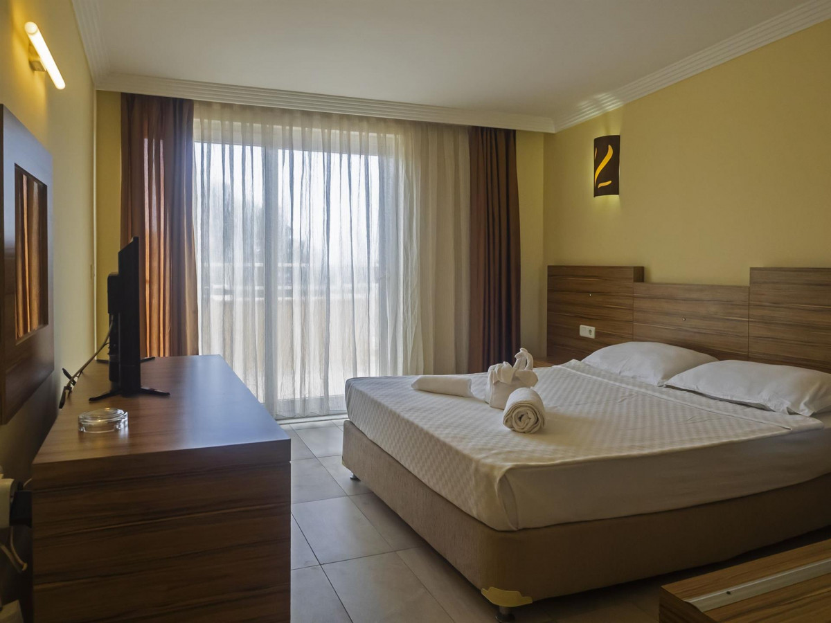 Отдыхали в этом отеле 14 дней, июнь-июль 2023, втроем с ребенком, в общем приличный отель, тихий спокойный, за 14 дней много раз менялось мнение об отеле, но в общем оценка 4, прилетели мы в 5 утра, нам предложили за 15 $ сразу заселиться, естественно мы сразу согласились! Комната приличная, стандартная, большая, три кровати, две односпальные и одна двуспальная, постельное чистое, приличное, полотенца тоже хорошие, комната светлая, все частенько! Туалет с душевой большие! Кондиционер работает отлично, расположение тоже хорошее, комфортно остужал комнату, прежде чем ехать читали отзывы, много плохих, но были и хорошие! То есть мы были готовы уже и цена за путевку все эти минусы компенсировала! Кран у нас бежал и как во многих отзывах писали, мы об этом сказали, но естественно никто ничего делать не стал, но так как нам за воду не платить, было в принципе все равно, закрытая дверь в ванную комнату, чтобы не слышал было этого и все отлично! Вода уходила нормально, все остальное в ванной работало хорошо! Сейф заявлено, бесплатный в номере! Он был, но никто ключи не дал и запрограммировать его было без этого ключа невозможно, первых дня 4 нам говорили, что ключи заказали и вот вот будут, но потом поняли мы, что точно сейфа не будет! Было конечно неудобно носить всегда с собой деньги и документы ! Так как замки в комнату не внушали доверия )) шезлонги и зонтики на пляже заявлены были бесплатные, но этого ничего естественно нет, так как у отеля нет своего пляжа, нам тоже об этом рассказывали небылицы, но факт есть факт, 40 TL и шезлонг будет, пляж отличный, дорога до пляжа через парк, занимала 1-2 минуты, все рядом, парк шикарный, есть и качели для детей и спорт площадка и красота природы!!! Море чистейшее, теплое, бывало после обеда иногда в море мусор был, но утром всегда шикарное и чистое ! Пляж каменистый, есть заходы в море из мелких камней, лучше конечно в обуви заходить! Зато вода прозрачная! Вернусь к отелю, бассейн хороший и чистился каждый вечер, за это огромное спасибо персоналу и руководителям конечно! Развлекательной программы нет, первые дня 4-5 была девушка аниматор, но толку от нее абсолютно не было никакого, потом и вовсе пропала! Детям развлекать себя самими надо было! В бассейне есть горка, все отлично работают, включали по просьбе! Персонал разный, но это человеческий фактор, много приветливых, добрых и открытых людей, но были и не очень приятные сотрудники, которые абсолютно не решали никакие вопросы, а ссылались на других сотрудников, идите и там спросите! По поводу еды, тоже мнение менялось часто, были приемы пищи, когда было сложно выбрать что-то приличное, но были дни когда просто шикарно кормили! Была и рыба и мясо и фрукты! Сладости конечно тоже чаще всего невозможно есть, пропитаны настолько, просто залиты сладким сиропом((! Но были и кексы просто шикарные! Видимо зависит от смены поваров, колбасные изделия просто отвратительные и персонал же видит что их никто не ест, но все равно каждый день куча этой колбасы! Официанты молодые люди все, девушек среди них не было, убирали моментально, как только в процессе приема пищи освобождалась хоть одна тарелка! Молодцы! Бармены конечно никакие, абсолютно ничего не умеют, даже детские коктейли не в курсе как делать! Что касается музыки, в 22.00 музыку выключают, дискотек никаких нет, мы попали в праздник, вот в этот ден