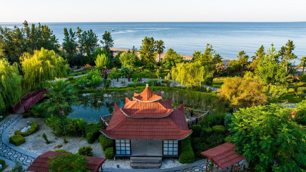 Отдыхала в отеле уже дважды, и готова поехать еще раз. Очень спокойный, размеренный отдых. Детей в отеле нет, тишина, поэтому отдыхают и уши и голова))). В ресторане мясо и рыба есть всегда, плюс овощи, фрукты, я не фанат сложных изысканных или национальных блюд - поэтому для меня еда отличная. Коктейли в баре на пляже, шампанское турецкое на удивление вкусное - в течение дня можно и выпить и закусить без проблем. Отличный кофе в кофейне в лобби. Магазинов в отеле нет, только небольшая лавка с необходимостями, за территорией отеля тоже в пешей доступности нет торговых точек. Так что просто отдыхаешь, загораешь, вечером живая музыка, есть спортзал с видом на море, по утрам йога в японском саду. Если вам нужен отдых с движухой, дискотеками- это точно не сюда. Мы жили в бунгало с видом на море- чудесное расположение, вышел и ты у бассейна, две минуты ходьбы- ты на море. Бунгало с видом на сад слишком сумрачными мне показались - напоминают наши лесные турбазы )))) так что советую выбирать номера с видом на море. Всем приятного отдыха))