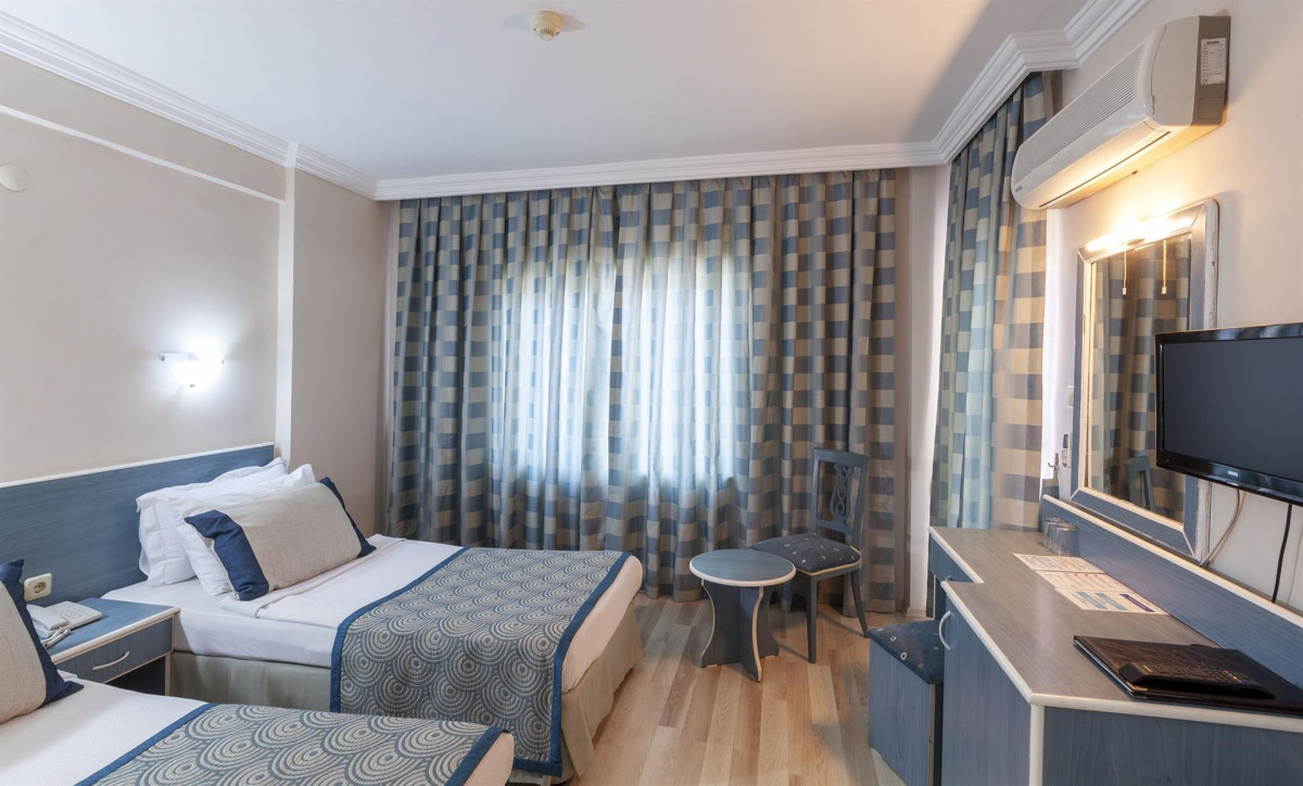 Были в Турции во второй раз, путевку взяли за неделю до выезда за 46 тыс на двоих за 6 ночей и 5 дней, ехали очень долго от аэропорта 3 часа, приехали на ужин опоздали сунули по булке с кусочком зелени и сыра (хорошо я палку колбасы захватила с собой), номер дали сразу не самый плохой без вида на море, но это для нас не принципиально, еда в отеле однообразная с утра блинчики по 2 шт в руки за ними очередь, ну и яйца вареные, а также молоко и хлопья различные, если попозже придешь блинчиков не жди,конечно овощи в изобилии и тушеные и свежие, мяса нет совсем, только курица и то порционно в руки, самое удивительное для меня, что нет выпечки и фруктов, арбуз или дыня по 2 кус порционно в руки, с нами был ребенок 12 лет, так он бедный сахар грыз без сладкого, давали к ужину какую-то массу из раздавленных типа манников не съедобно абсолютно, отдельный разговор о спиртном - один бокал в руки и то, если водка, то на самом дне рюмки, если вино или пиво то половина или меньше бокала, даже дала бармену 5 лир, не помогло, видимо избалован большим, плюнула и больше не давала денег, вино порошковое отвратное, брали рядом с отелем в маркете по 5 долл за бутылку гранатовое. Уборка была, но как с начала были 2 шампуня, больше не добавили и полотенце грязное забрали, а чистого так и не принесли, хотя я просила, вообщем я могу сравнить, поэтому туда я больше не поеду, дала бы 3 звезды, и 2, 5 только за близость к морю.