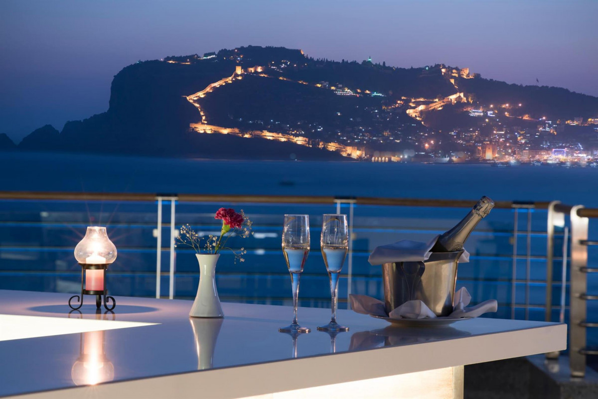 Отель неплохой, но не в современном стиле. Еда: очень вкусная рыба в ресторане на пляже, сибас и дорадо просто очень вкусно, кефте, сендвич, всё вкусно, обедали только на пляже, в ресторане в отеле очень много народу, душно, неуютно. Также очень понравися ужин в ресторане ала'карт, выбрали рыбный, совсем другой уровень еды, и вообще очень уютно и свежо. На завтрак, в отеле вкусные омлеты, ну и конечно булочки) кстати сосиски тоже неплохие. На ужин был вкусный гуляш, остальное как и везде, пойдет) По четвергам рыбный день, креветки,раки, крабы, самые вкусные из всего креветки, потому что раки и крабы были полусырые, пахли морем. Напитки: как везде,пиво,белое вино норм, махито - хороший, есть импорт, виски,ром белиз. Море: море через подземный переход с отеля, мелкая галька, но есть и крупные камни, мы сразу исследовали дно и купались уже там ,где их меньше(ребёнок одевал аквашузы), напрягали,что много местных ходят на наш пляж, т к. там меньше камней, мы отдыхали с 23 - 31 июля, и нам повезло,что море бушевало только последний день, и не пускали в море, всех выгоняли из моря из-за опасности. Но вечером зато до шторма мы каждую ночь купались в море, это конечно супер. Ещё есть свой пирс, кто любит попрыгать, можно и просто спустится и поплавать на глубине. Море очень чистое и прозрачное, благодаря волнорезам. Анимации: вечером отличные шоу, это и акробаты и циркачи и фокусник и танцы живота, понравилось) Сам отель под стиль корабля, не очень современно, но месторасположение очень хорошее, выходя из отеля есть набережная,по которой мы гуляли каждый вечер, есть Мигросы и большой и поменьше, аптека, разменный пункт, всё рядом, через 2-3 остановки торговый центр Алланиум. Туристы: большая часть иностранцы: это и поляки, немцы, венгры, румыны, сербы, шведы, англичане, русских мало. В общем мне понравилось само месторасположение, жаренная рыба на море в обед, вечерние шоу, не понравилось: крупные камни в море, платный вай фай, ну и конечно далеко от аэропорта, но я люблю Аланию за красивые места и большой выбор отелей)