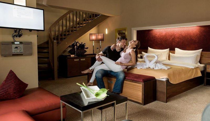 JUNIORSUITE LIFESTYLE (34 кв.м. Гостиная / спальня с дубовым полом и гостиной, письменный стол, балкон (частично французский стиль балкон). Ванная комната с большим душем и отдельным туалетом, фен, косметическое зеркало, стул, пушистый халат и тапочки W-LAN, плоский экран HDTV, 5 каналов SKY (немецкий), сейф, мини-бар Кровати могут быть разделены, также комната может использоваться как двухместный номер )