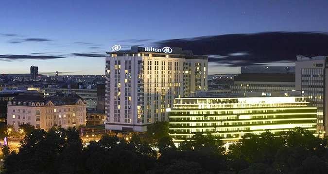 King Hilton Guestroom ((ок.27 кв.м) - ванна/душ, туалет; кровать king size, отдельная кабинетная зона; кондиционер, телевизор с LCD-экраном (кабельное телевидение), беспроводной Интернет, мини-бар, телефон, фен, халаты, тапочки; возможно размещение двух человек.)