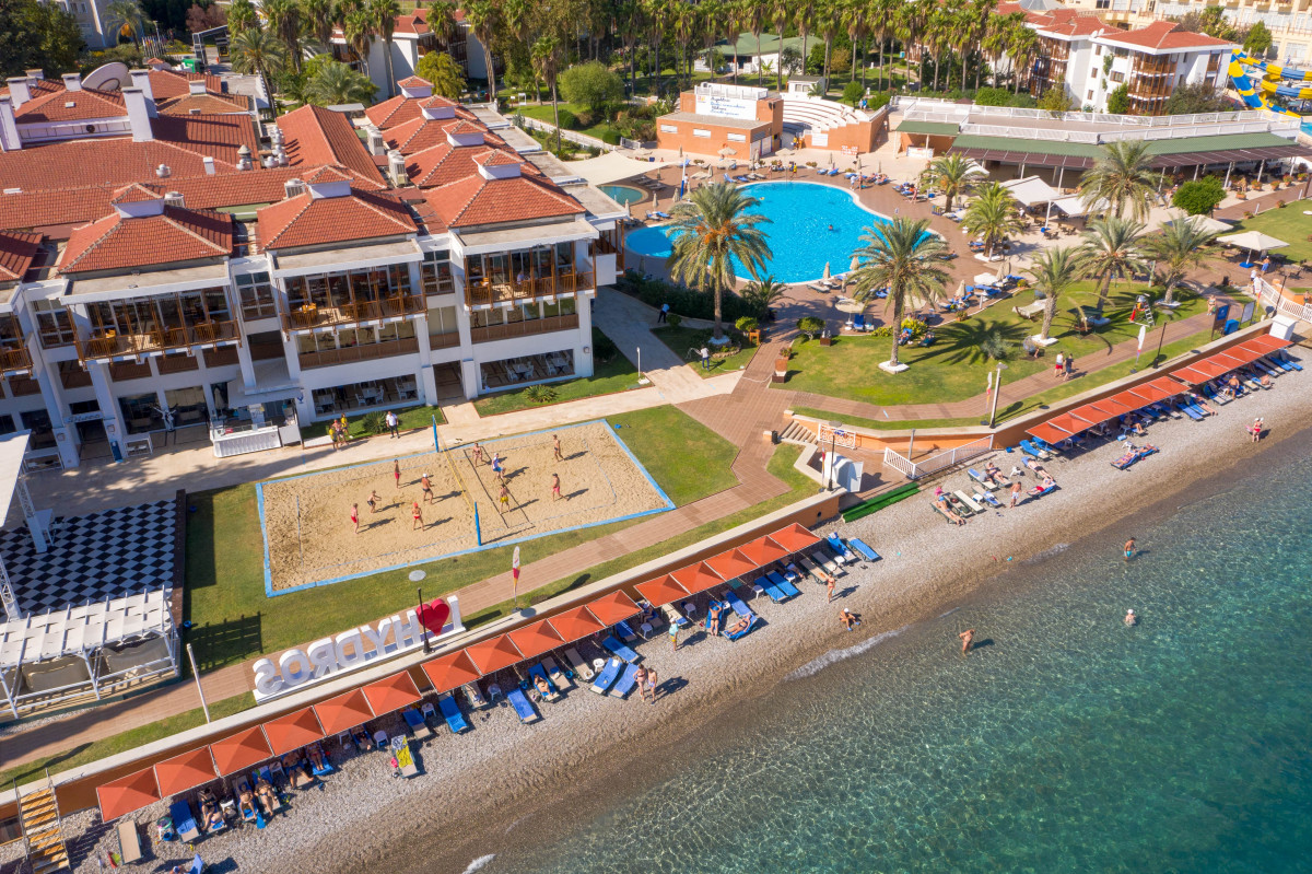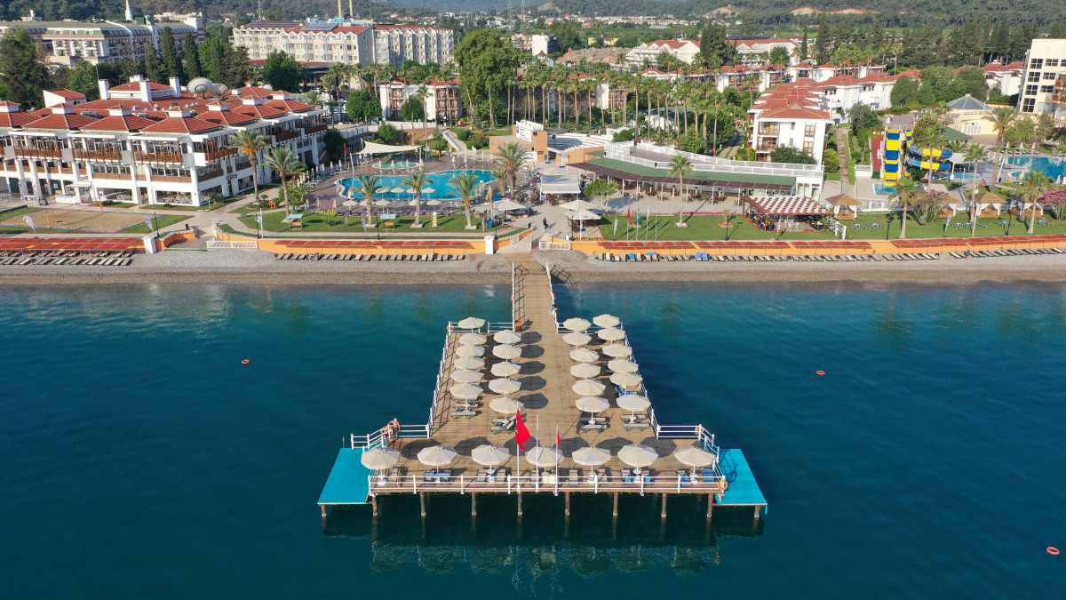 Отдыхали вдвоём в этом отеле с 18 сентября по 27 число. Брали номер club standart,но из за загруженности отеля дали номер лучше и больше в главном здании hotel standart на 3 этаже с обалденным видом на море и бассейн. Номер отличный просторный со сдвоенной кроватью и одинарной,три спальных места. В номере всё есть: тапочки,халаты,полотенца, гель-мыло,сейф,электрический чайник,чай,кофе в пакетиках,вода,стаканы.Есть балкон со столиком и двумя стульями. Телевизор на 60 с лишнем каналов,можно вставить флэшку и смотреть свои фильмы.Кондиционер регулируется только силу выдува,хотя на блоке управления есть выбор температуры и переключение на теплый воздух(обогрев) Уборка каждый день. Погода была супер жаркая 40 днем и 28 вечером. Море супер чистое и теплое,есть пирс довольно большой,можно с него прыгать в море,ночью пирс подсвечивается,как и территория. Пляж нормальный,длинный. Но лучше заходить в воду в коралках. Есть души и переодевалки.Лежаки занимали с 7 утра. Территория большая,растут гранаты,апельсины,хурма вроде. Бегают курочки,много кошек. Но самая движуха у бассейна возле ресторана и бара,в который все ходят за коктелями,пивом. Есть турецкий чай и две кофе машины. Вечером после ужина все собираются за столиками у бара. Там обычно проходят выступления,живая музыка и песни. Есть отдельный танц пол ещё,там после шоу тайм идет дискотека или днем пенная дискотека. В амфитеатре идет шоу и они классный,тут и танца и окрабатика и фаер шоу. Ресторанов два,основной и алякарт. Кормят отлично,еды много и всякой на любой вкус. Курица,индейка,говядина,рыба это на постоянке,разные фрукты: дыни,арбузы, апельсины,сливы,виноград,инжир,яблоки и др. Голодным не останешься точно. Каждый вечер тематический ужин. То турецкий,то итальянский,то мексиканский,то китайский. Поэтому были блюда из этих стран. Пицца,роллы,раки,такос... В ресторане есть балкончики, где можно кушать и любоваться видами. В ресторане также можно брать пиво и вино,газировки,соки,чай,молоко. В отеле много отдыхающих иностранцев. Помимо русских поляки,турки,украинцы,немцы и др. В общем отель оставил приятные впечатления,мы бы вернулись ещё раз. На 9 ночей на двоих из Москвы вышло 199тр Плюсы: Территория ухоженная Номер в главном корпусе Море,пляж,пирс Расположение хорошее,15 мин и у башни с часами Сервис: принесли чемоданы в номер,уборка каждый день. Анимация Шоу программа Минусы: Курит каждый второй,даже в ресторане на балконе. Бесплатные коктели,однообразны. Нет места у ресепшена,где переодеться,когда только приехал,а до заселения ещё долго. Можно только в туалете или на складе