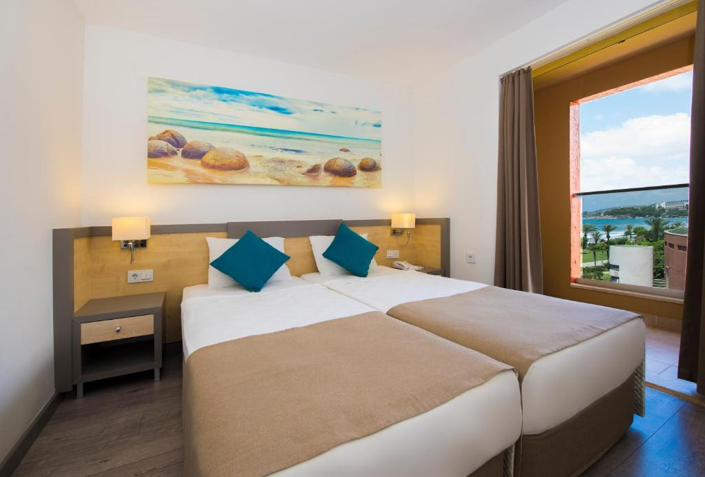 Можно пользоваться инфраструктурой всех трех отелей. Территория большая, зеленая и ухоженная. Много бассейнов, и хлоркой, кстати, не пахнут, видимо фильтруют хорошо. Проводятся анимационные программы: и в бассейнах днем, и вечером (не посещали ни ту, ни другую, сказать ничего не могу). Есть мини-клуб, но наши дети не посещали, все время проводили на море. Аквапарк, хотя и небольшой , но для детей 10-ти лет хватило. Самое главное достоинство - море/пляж (хотя пляж можно бы убирать и почище, но это дело самих отдыхающих: урн для мусора на пляже много, но многим, видимо, лень 3 шага до них сделать). Море очень близко. На пляже - мелкий песок. Вход пологий без камней (их не найти, даже если очень постараться). Вода в море чистая, прозрачная, а главное очень теплая, можно весь день не выходить и детей из моря "не вынимать". Дежурят спасатели. На море - водные виды спорта (парашют, банан, батутный парк (для отдыхающих от Tui - точно бесплатный). На пляже есть бары: вода, газировка, пиво, соки разбавленные. Что-то покрепче, тоже, наверно, есть, ни разу не интересовались, правда. НЕТ никаких вирусов... не "ведитесь" на заказные отзывы, чаще мойте руки, фрукты и овощи, и все будет хорошо. На ресепшн есть бесплатный Wi-Fi ( в номерах нет даже платного), иногда очень даже бодрый, все зависит, наверно, от количества пользователей, а их в полуденные и вечерние часы там ну очень много, места присесть иногда просто не найти. Еда: голодными точно не останетесь: каждый день были блюда из курицы и рыбы, гарниры разные, много зелени, фруктов, овощей; салаты, правда, заправленные не пробовала, но они есть, и не один вид. Для кого курица и рыба - не мясо, с говядиной потуже, но есть (в котлетках, рулетах). На завтраки - омлет, яичница, глазунья - все стандартно, но вкусно. Короче, кормежка весь день: пицца, что-то типа шаурмы с разными начинками, пончики, кексы... выпечка для четверки - очень даже не плоха, пробовала, правда, совсем не многое, но то что пробовала понравилось. Посуда была чистая. Уборка на "4", белье за 10 дней сменили 2 раза, полотенца меняли, подметали (не мыли) и мусор выносили каждый день. Номера старенькие, не помешал бы ремонт, хотя бы косметический. Standard room, очень не функциональны и маленькие, приступов клаустрофобии не будет, но на том и все. Нет стола или просто столешницы типа полки (в Family точно есть): косметику, средства для загара, просто всякие мелочи положить негде. Чемоданы, сразу предупреждаю, девать некуда. Будут просто стоять у стены, а вы будете ходить и за них запинаться, хотя их можно использовать для размещения одежды из-за отсутствия места в шкафу. Шкаф маленький (в нем же холодильник и сейф платный), плечики есть и не мало, но хлипкие какие-то: пара маек/футболок, и они не выдерживают, падают... полок маловато, на двоих хватит, а вот на 3-х человек уж точно нет. Один стул со спинкой на номер: так на нем вся одежда и размещалась. Балкончик маленький, только для сушки купальников и полотенец. Сушилка есть, но вот когда ее раздвинешь, так места на балконе останется ровно на 1 человека. Кондиционер старенький, работал исправно, охлаждал очень хорошо, но уж с таким шумом и скрипом, что ночью иногда страшновато становилось. Слышимость в номерах превосходная (при чем во всех без исключения). Слышно как соседи не только разговаривают, но и душ принимают и ...все остальное. По коридору люди ходят как