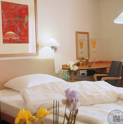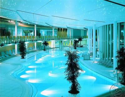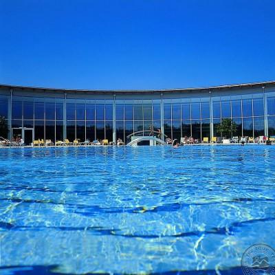 на холме, в 200 м от центра курорта. Соединен с термальным комплексом крытым отапливаемым переходом. Из окон отеля открывается вид на предгорья Альп.