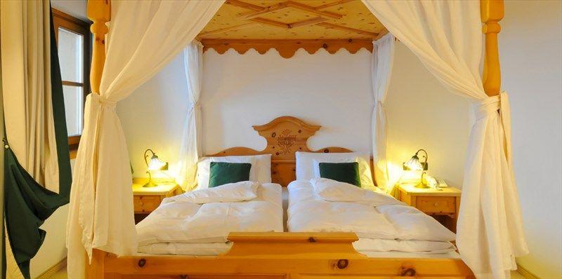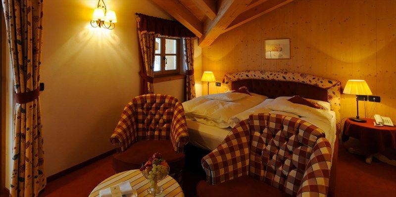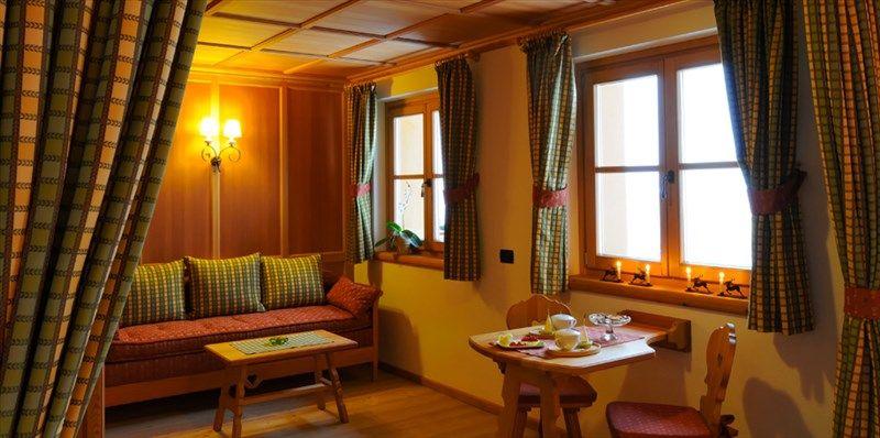 Luxury Suite (ок.48 кв.м) (номера класса королевский люкс, оборудованные спальней с двуспальной кроватью (может быть разделена по требованию) и гостиной с дополнительной кроватью; майоликой печь с выполненным вручную орнаментом дополняет изысканное убранство номера; номер 105 "Dell'Arnica" расположен на первом этаже и имеет выход к отдельной лужайке; номер 205 "Dei Cirmoli" и номер 305 "Delle Marmotte" расположены на втором и третьем этажах соответственно и оборудованы большими балконами и просторными гардеробными; из их окон открывается вид на небольшой лес из высоких деревьев, горы и часть города; просторные ванные комнаты оснащены туалетами-биде, гидродушем Teuco, отделенным от раковины, и ванной, которыми можно пользоваться одновременно; возможно размещение от двух до четырех человек.)