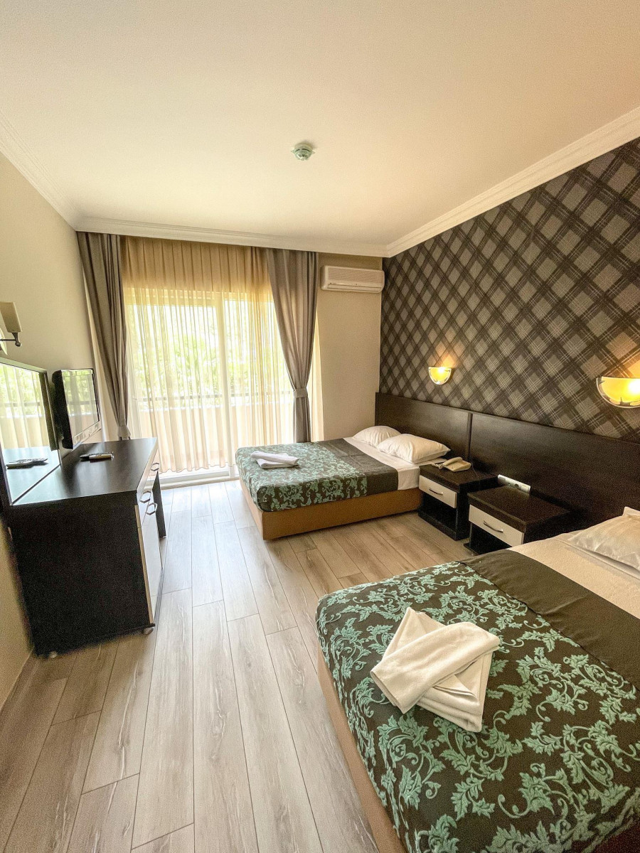 Всем доброго времени суток! Отдыхали семьей из 7 человек в августе 2025 года. Путевку брали за 3 недели до вылета, особо вариантов уже не было, выбрали этот отель по отзывам, в целом сильно ни на что не рассчитывали. Нас приятно отель удивил) Территория зеленая, хоть и небольшая, бассейна три, большой и два маленьких, мы купались только в большом, он чистый и прохладный, горку починили при нас, до этого не работала. Анимация тоже работает, дартс, водное поло, вечером детская дискотека, конкурсы. Уборка каждый день, полотенца тоже меняли регулярно, оставляли доллар уборщице. Приятно пахнет постельное белье и полотенца, но оно уже «уставшее» Питание среднее, но работает часто гриль, была даже красная рыба на гриле несколько раз, курица часто, какие то колбаски из фарша, много всяких соусов, макароны, картошка фри, вкусные крем супы, каши утром бывают, яйца или блинчики жарят в зоне гриля утром тоже. Очень очень много овощей и зелени, на любой вкус, все свежее и вкусное, из фруктов при нас были яблоки, арбузы и дыни. Очень вкусный хлеб у них, сладости дают на обед и ужин, тоже вкусные. Напитки в баре выдает бармен, соки, пиво, вино. Вода из кулера всегда в открытом доступе, можно набирать с собой на море, там нет зоны перекуса. Утром возникают проблемы с кофе аппаратами, их приходится ждать когда заправят, но это обычно быстро делали. Море. Оно чистое и теплое, НО… в море огромные камни, которые даже поднять не каждый сможет, нужно входить осторожно очень, многие заходят в обуви или кораллках, есть очищенный от камней вход у каната с буйками, мы там купались, на глубине кстати камней нет, но там взрослый человек может стоять в полный рост. Лежаки утром до 10 всегда можно найти свободные, полотенца на пляж можно взять за депозит. Отдельное спасибо массажистам Алмазу и его другу со сложным именем (простите не запомнила), вы профессионалы своего дела! Так же два раза съездили на экскурсии от турецкого Димы, читая отзывы думала что это заказные, все про них пишут, но сами теперь проверили)) Общались с Димой, хорошо говорит по русски, скромный, ненавязчивый и ответственный парень, с одной экскурсии поздно возвращались из за пробок (хотя он предупреждал об этом нас сразу) и опаздывали на ужин, шли мимо него и он прям выбежал нас встречать, тоже переживал что нас привезли немного позже, но на ужин мы успели)) Успехов вам и благодарных туристов! Отель на один раз съездить, если нет других вариантов можно)) Это все таки лучше отелей, окна которых выходят на проездные улицы, мимо которых мы шли на пляж. Кто едет с целью отдохнуть и хорошим настроением, в любом месте именно это и найдет