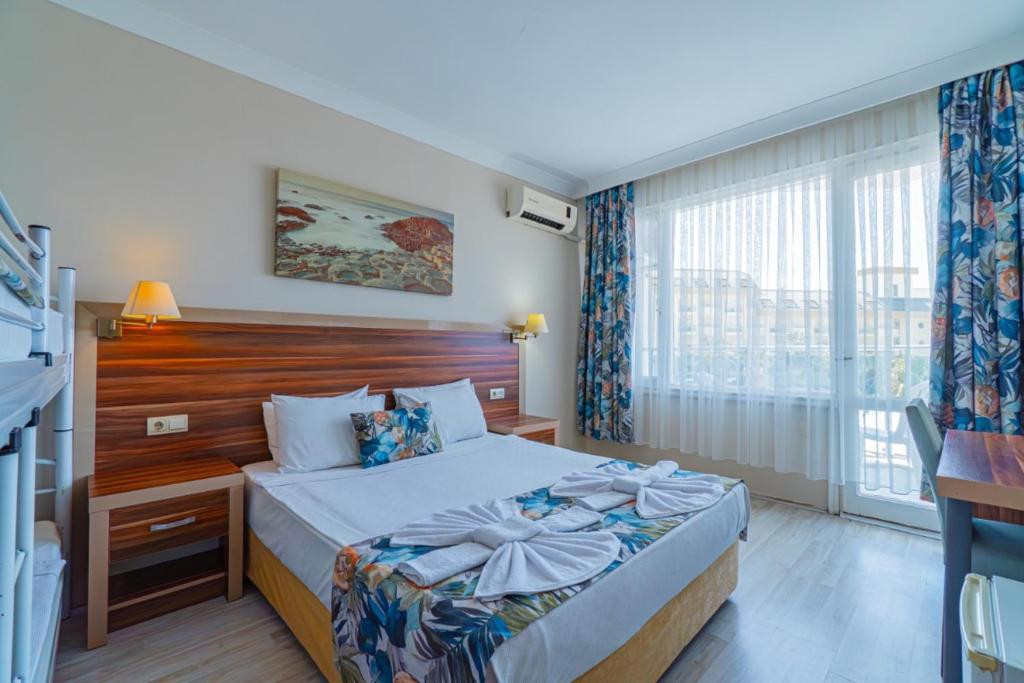 Начну по порядку. Отдыхали семьёй с 2 детьми 2 года и 15 лет. С 31 августа 2025 по 13 сентября 2025 года. Заселение: менеджеру Даухану огромный привет от принцессы- Анюты заселили в 14.00,как и прописано в концепции отеля,номер был с 1 двуспальной кроватью и 1 двух- ярусной кроватью. Номер стандартный,безо всяких изысков,но нам это и не нужно было, т.к.приходили только ночевать,кондиционер старенький, но работал исправно, холодильника не было,но по просьбе на ресепшене -сразу принесли,балкон выходил на бассейн,шумновато,но терпимо,вечерние дискотеки ровно до 11,потом тишина) Питание: все,как и обычно на шведском столе,голодными не останетесь точно,мясо,курица,рыба-все было,бургеры,картошка фри и тд. На пляже: в баре гамбургеры,картошка фри,овощи,из напитков кофемашина,спрайт,кола,фанта,алкогольных напитков нет. Анимация: слабенькая, но нам она и не нужна была,вечером включали музыку,русскую,турецкую-чередовали. Пляж: море было шикарное,как парное молоко, заход хороший,брали экскурсии на гидроцикле и парашют с катером, экскурсию брали у нас на пляже по правую руку,менеджер Марьяна-супер До пляжа идти 3 мин,спуститься с горочки. Отдыхом очень довольны, брали путевки в мае,на 14 дней очень выгодно получилось, 4 сентября у нас прилетела мама с сестрой к нам,у них эта цена уже не на 14 дней,а на 10 дней. Выгоднее брать заранее. Приедем обязательно еще! Даухан,огромный привет тебе от всей нашей семьиНадеюсь,что ты увиделся с дочкой и все хорошо