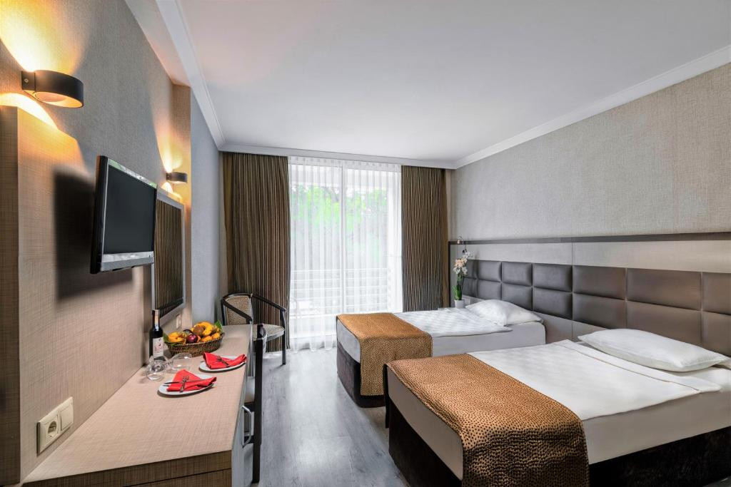 Отель состоит из 2 пятиэтажных корпусов. Всего 218 номеров, из них 97 номеров с видом на море и 121 номер с видом на парковую территорию отеля. Есть 2 номера Standard для маломобильных гостей. Обращаем Ваше внимание, что отель не размещает только мужчин в одном номере.