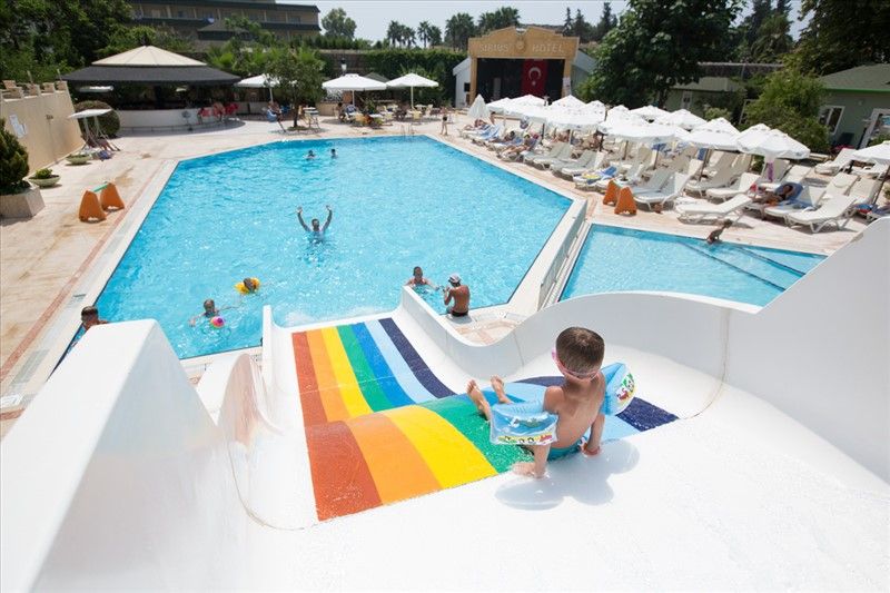 В отель приехали 08 июня 2023 г. В общих чертах отель не плохой, немного уставший, но чистый. По питанию на 4 не тянет. Ассортимент скудненький, но голодными не оставались. Пляж песчаный при заходе в море крупная галька. Пирса нет. Шезлонги на море и у бассейна всегда можно найти. Большой плюс отелю, это персонал. Все добродушные, даже если не понимают по-русски стараются услужить. Да, анимации нет никакой. Хочу обратить ваше внимание на ближайшее к отелю уличное тур.агенство. Мы купили там экскурсию на гору Тахталы. Заранее обговорили, что в горах происходит во время дождя, потому-что были прогнозы. В итоги нас убедили, что дожди там кратковременные и все предусмотрено. По факту мы попали под сильнейший ливень. Машины раздолбаные, с крыши вода на нас текла. Как итог мокрые и замерзшие. На пол пути развернули машину и поехали в отель. Потраченное время и деньги.