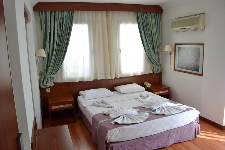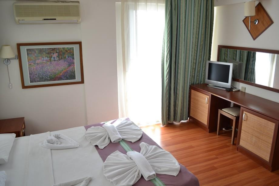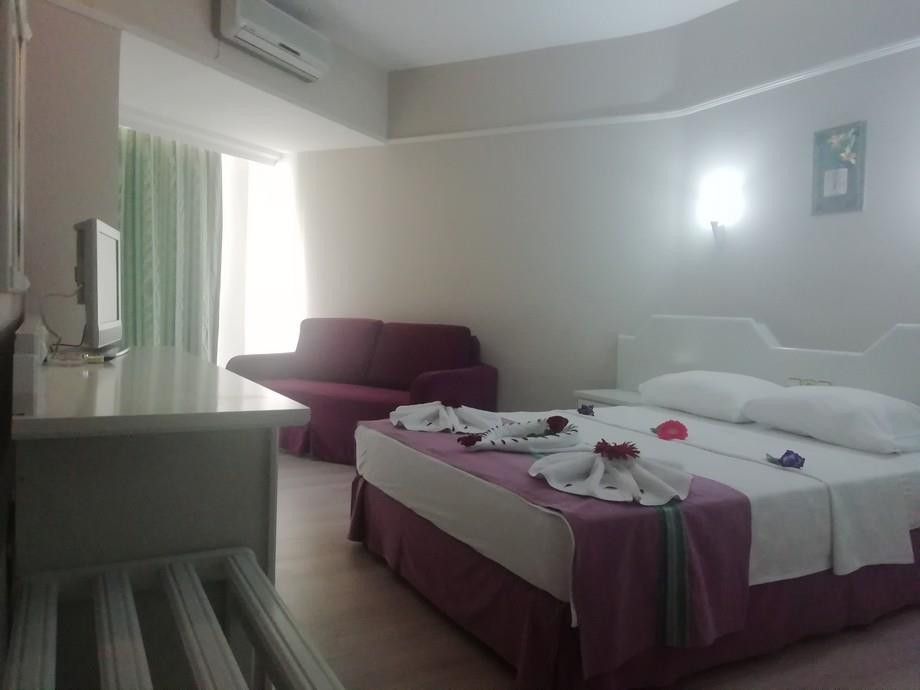Отдыхал один. В отеле есть и плюсы и минусы. Заселили в основной корпус. Он отремонтирован, но на одного номер маленький и без холодильника, правда с большим балконом. Вид был на город и это хорошо, потому как у бассейна дискотека до полуночи. Питание не большой выбор, но каждый день что-то новое. Еда вся свежее. Пиво слабое, но вкусное. До центра два шага, а там поющие фонтаны и старый город, улица баров и порт, интересные магазины и дорогой гранд базар. Море хорошее, но поскольку своих шезлонгов у отеля нет, то лучше купить на берегу напиток за 200-300 лир и загорать на нем. Экскурсии рекомендую брать у Руслана, как выйдешь из отеля, то сразу направо. У него все точно по времени и хорошие порекомендует, и ценник не завышенный. Басейны в отеле простенькие, но для детей есть горки. Отдыхают 50 на 50 русские и турки, друг другу не мешают, прочие иностранцы попадаются в отеле редко. Для 3 звезд все хорошо и сравнить мне есть с чем.