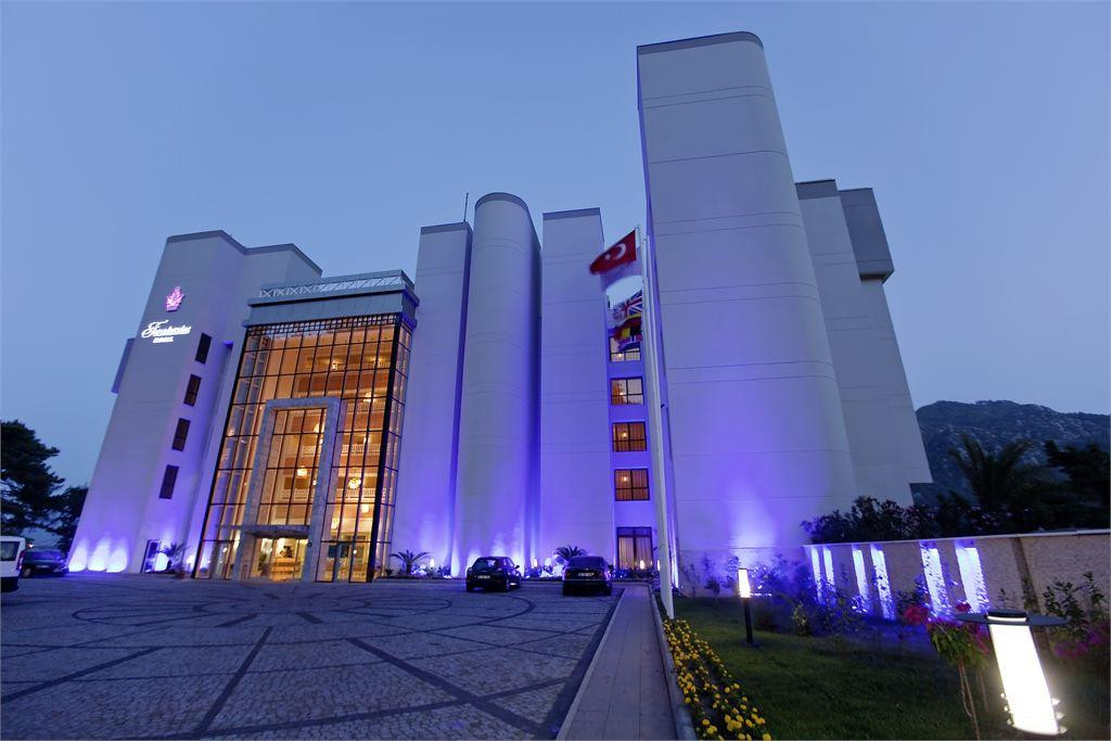 В курортном поселке Ичмелер, на берегу моря. Расстояние до аэропорта Даламан составляет 90 км.