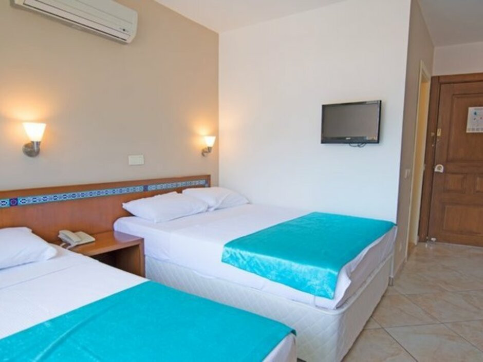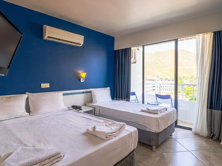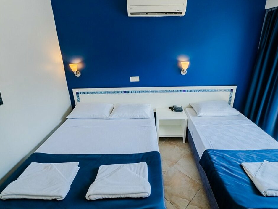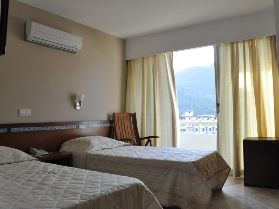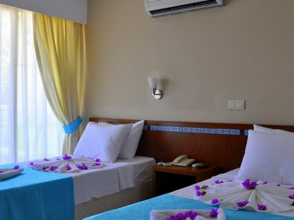 Отель соответствует 3 звездам, не больше, дверь в номер с пинка закроешь, а открыть - целый квест, чувствуешь себя взломщиком сейфов, окна выходили напротив турецкого бара, там так орали, спать до часу ночи оч.сложно, кондей трещит, в остальном норм. чисто. ЕДА ОДНООБРАЗНАЯ ,анимации нет, напитки пиво, вино, джин, короче, если бы заявили 3 звезды претензий нет, но не 4.