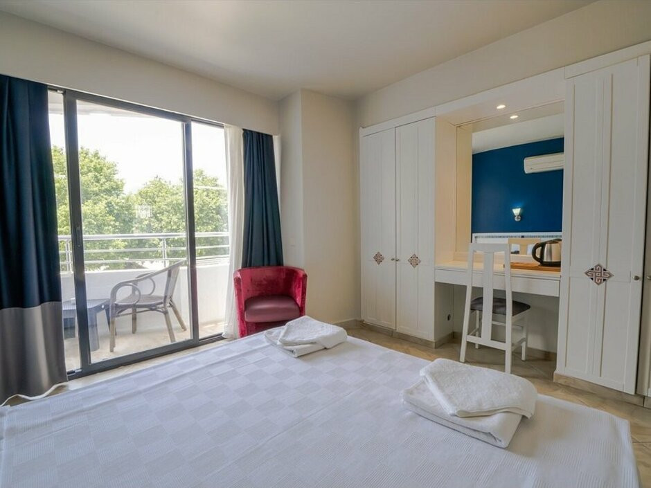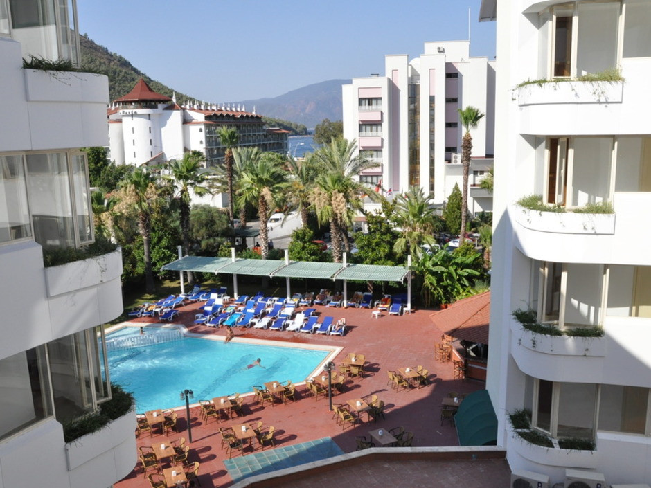 В 110 км от аэропорта г. Даламан, в 10 км от г. Мармарис, в поселке Ичмелер, в 100 м от пляжа.