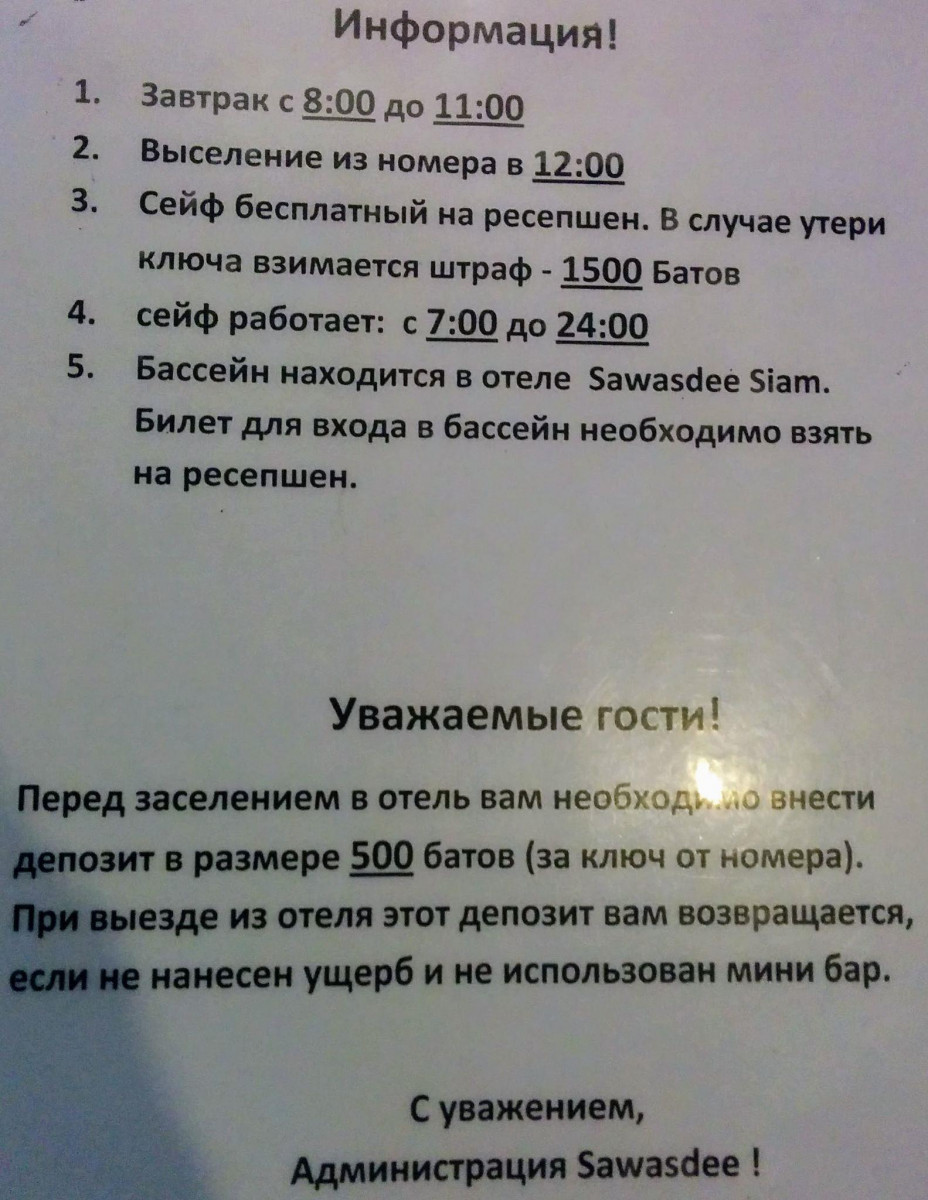 Отдыхали в марте 2016. Сразу скажу - отель для тех, кто будет там только ночевать и то не всегда) расположение идеальное! До набережной близко, до walking street тоже на туке пара минут, central festival - все в шаговой доступности! Напротив отеля seven eleven, куча макашниц с фруктами, шашлыками и не только. Так же очень много баров, ночью при закрытом балконе и окне слышно музыку часов до 6 утра. Заселили нас сразу по приезду, взяв депозит 500 Бат. Женщина у ресепшена посоветовала просить четный номер, так как все нечетные номера на солнечной стороне и там жуткая жара! Нам достался 606, на 6 этаже. Судя по всему с номером нам повезло, так как я читала отзывы об отеле, в некоторых номерах нет даже кондиционера, балкона. В нашем было и то и другое, вид конечно с окна и балкона не айс, но нас это особо не волновало) кондей работает исправно, правда шумноват немного. Туалет и душ вместе, при чем душ прям над унитазом, но это тоже ерунда. Никакой живности в номере не было. Есть холодильник, старенький телик, фен, шкаф, столик с зеркалом, сейф на ресепшене. Каждый день оставляли 20 Бат уборщице, в номере только подметали, меняли полотенца и застилали старое белье, которое за две недели ни разу не поменяли, оставляли в холодильнике две бутылки воды. Как плюс - бесплатный wi-fi с отличной скоростью. Завтраки однообразные, через пару дней я уже только пила чай, а потом кушала где-нибудь в другом месте. Просто не лез уже этот рис с соусом) в общем, если есть вариант без завтрака, то берите его, лучше покушать где-нибудь в местном кафе, все равно недорого и на много интересней, чем сидеть за грязным столом и отмахиваться от мух). Из персонала самый доброжелательный был только охранник, всегда улыбался и здоровался) остальные девочки вечно с недовольными лицами, будто ты им должен что-то.. На просьбы откликаются не охотно, иногда приходилось ждать их долго возле ресепшена. Повторюсь, что если вы в отеле только ночуете, то все перечисленные минусы - это полная ерунда, можете смело ехать в этот отель.