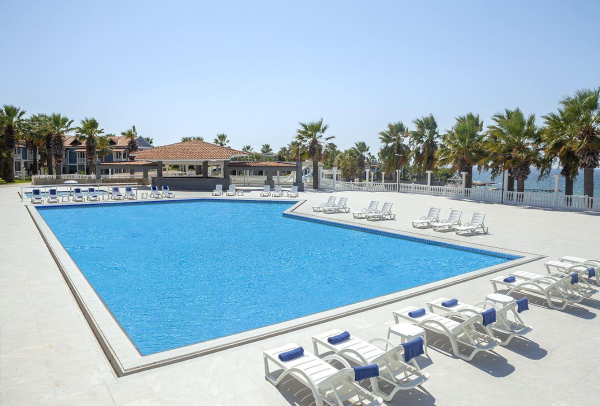 Отдыхали в отеле в июле 2023года. В отеле всё замечательно было, еда вкусная, всего достаточно, кафе со сладостями весь день, на пляже пицца, гезлеме, снэки, фрукты, всё супер, но море это большой минус. МИНУС МОРЯ -это медузы, которые жалили постоянно, не расслабиться, море мелкое до буйков можно дойти и воды будет по грудь, около берега камни, водоросли прибивало к берегу, на территории отеля берег сотрудники старались и убирали, вода теплая. Мы купались в основном в бассейне.