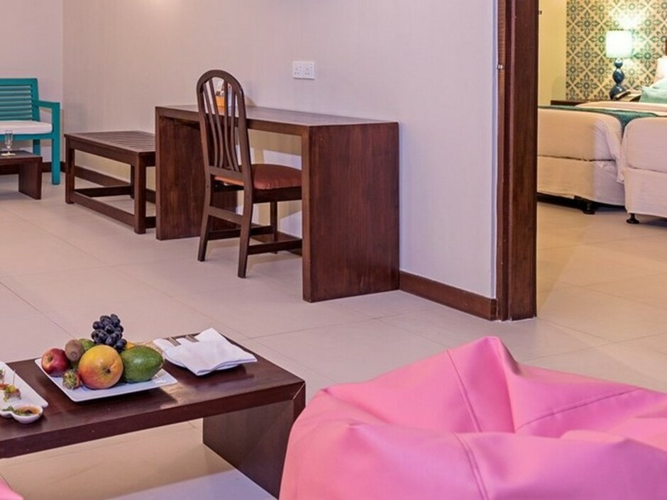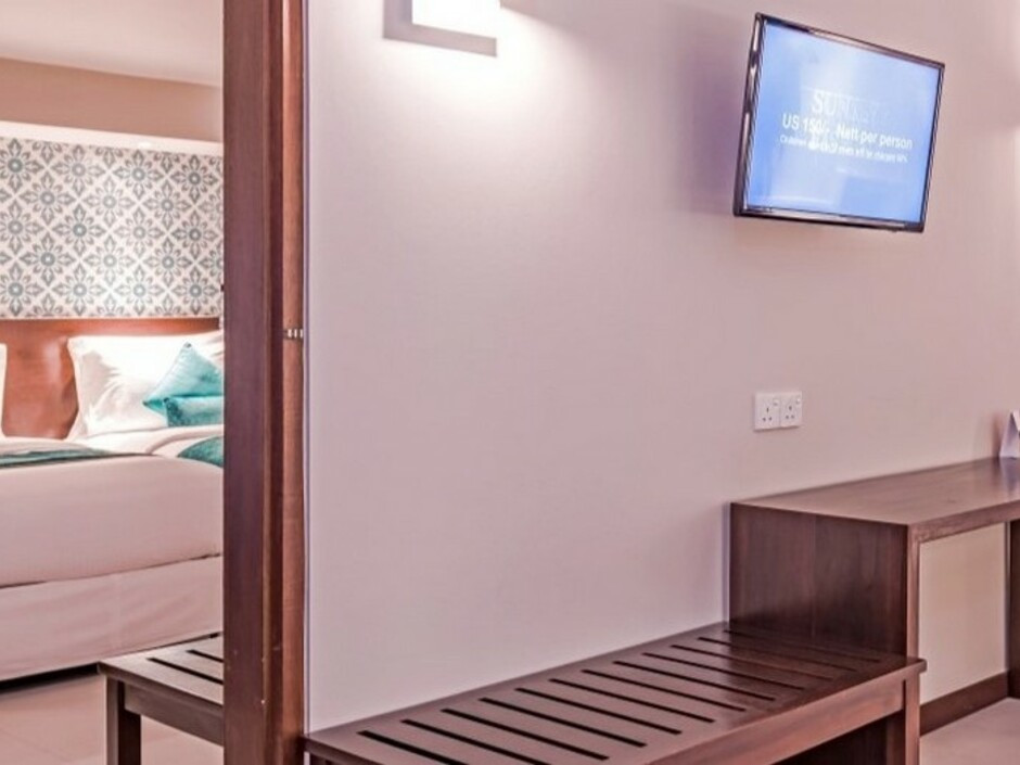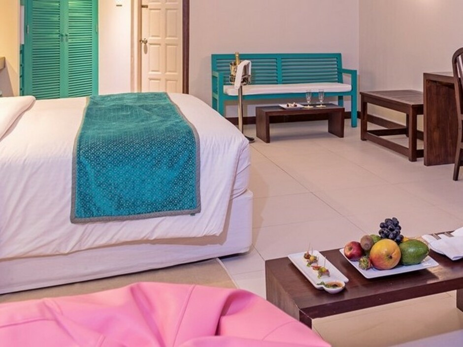 Отличный отель! Большая зеленая территория, прекрасный вид. Услуги: есть теннисные корты (не пользовались, не знаем, бесплатно ли), детский клуб, теннисные столы (бесплатно). В водном центре развлечений была русскоговорящая девочка местные жители, снаряжение для снорклинга (ласты, маски и, если нужны, то жилеты (жилеты были в номерах также) - бесплатно на весь период проживания. Можно раз взять и отдать перед выездом. Ежедневно бесплатно можно катать 1 час на каноэ и что-то еще. Вывозят на лодке сопровождают к рифу на снорклинг - бесплатно, но предварительно нужно записаться. Есть платные услуги по типу водных мотоциклов. Отель предоставляет бесплатные две экскурсии: 1 - вид на закат (отплываете недалеко от отеля и наблюдаете закат с лодки/катера), 2 - к дельфинам (тоже недалеко от гостиницы и наблюдаете. как группы дельфинов плавают. Есть так же платные экскурсии. Питание разнообразное и вкусное (в основных ресторанах много видов десертов, экзотические фрукты (маракуйя, драконий фрукт и т.д.), мороженое с различными добавками, морепродукты (в основном небольшие крабы половинками, а так же кальмары, креветки - не часто), рыба в основном тунец в различных вариациях и красная рыба (в отделе японской кухни), мясо - говядина, это логично, т.к. страна с мусульманским вероисповеданием, но была иногда даже свинина курица. Понравился отдел с индийской кухней. Для жителей океанических вилл отдельный ресторан - там подают еще вонголе и мидии, на ужин к террасе подплывают небольшие акулы, которых можно покормить. Есть бассейн, что работает до 19:00 ежедневно с баром (прям из воды можно выпить вкусный коктейль), напитки в баре хорошие (алкогольные напитки хорошего качества, есть импортные. Безумно понравилась обычная фанта, вкуснее не пробовали - даже выпросили пару бутылочек с собой домой). Бар еще есть на серферской стороне - там напитки еще вкуснее. Маргариту делают бесподобно! там же делают пиццы - реально вкуснее не пробовали, ингридиентов не жалеют. С другой стороны есть другой бар и снеки (fish&сhips, картошка фри, милкшейки. небольшие мясные стейки и все в этом роде) - так что голодными не останетесь точно! Отношение персонала приветливое, есть русскоговорящий парень на ресепшене. Обращались к врачу по необходимости - нас довезли (было недалеко, но ногу повредили), осмотр, выдача хладоэлемента (дали с собой под честное слово, когда возвращали врач уже и не помнил, но был благодарен, что вернули), лекарств - все бесплатно! Были в спа: просто супер! Есть скидки на комплексные массажи, перед посещением угощают приятным вкусным чаем, который выберете вы из предложенных. Жили в Beach Villa - номера отличные, встретили нас с корзиной фруктов, убирают часто, пополняют мини-бар (и да - он бесплатный), есть кофемашина, капсулы к ней чай, сахар. чашки, вода), русский канал - 1, поэтому в основном, если и включали телевизор, то слушали местные музыкальные каналы. За 2 дня до выезда переселились в Ocean Villa (доплата за сутки 100 $) - где к нам прикрепили ответственного на машинке, который катал нас в ресторан и из него, спа, отвозил вещи в прачечную, общение было через WhatsApp. Он еще и быстро ездил, что было дополнительным развлечением. В номера ждала бутылочка игристого и фрукты. Номер в этой вилле больше есть терраса со своими лежаками свой выход к воде, куда подплывали небольшие акулы тоже - было здо