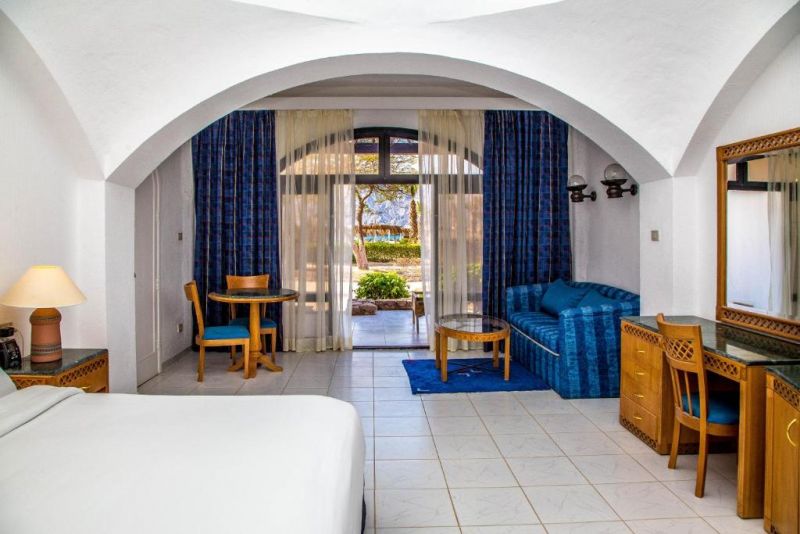 Просто ужасный отель. Везде мусор, пластиковые стаканы, бутылки, раздавленные финики (напоминают гов.. такого же цвета). Еда однообразная, картофель готовить не умеют (он всегда пресный, полу сырой). Фрукты позор -крошат кусочками подходит и брать это мессиво даже не хочется. Столиков в столовой не хватает поэтому сев за стол на большее количество людей Вас могут попросить пересесть за другой столик когда вы уже кушаете так-как пришла семья местных. Мясо выдаю можете не удивляться его просто выпрашивать, хотя местным кладут в тарелку пока тот не скажет стоп. Да, ещё в столовой видимо не работает кондиционер, поставили два переносных но толку 0 представьте себе как вы кушаете в жаре. Все развликухи происходят в пик жары то этому на них мало кто ходит или вообще не ходят (ну представьте себе аква гимнастика в пик жары 12.00 в бассейне по пояс, ну и как вы думайте вы не обгарите?) Вечером это подобие развикаловки с предыдущими согласна одно и тоже фантазия у них на нуле. Да ещё, лежаков там нету, поэтому будте готовы простоять половину отпуска и на пляже и у бассейна если вы не просыпаетесь в 6.00. Так как большинство лежаков заняты полотенцами они просто лежат, если ты убрал полотенце и занял шезлонг можно столкнуться с недовольством семьи местных часов в 11.00 что это их место и ты должен свалить. Наши видя, что местным можно так поступать тоже начинают так делать (поэтому полотенца лежат круглосуточно. Так как экскурсии из этого отеля нету (предлагают Петру и квадрики), то местные предприимчивые люди предлагают на своей лодке голубой, что у оттеля к каралам свозить 25$ с человека, они же за 10$ вас показали на верблюде, за 10 свозят в Дахаб (ближайшая цивилизация) и т.д. при том не удивляйтесь, что чипсы, мороженое, шоколад, сувениры и т.д. у Миши в местном магазине будут дешевле чем в Дахаб. Море оно прекрасно пока вы не посмотрите в них, а там опять мусор (стаканчики, бутылки, канистры, шины на склоне в глубине и т.д. Поэтому решать вам захотите ли вы так отдахнуть.