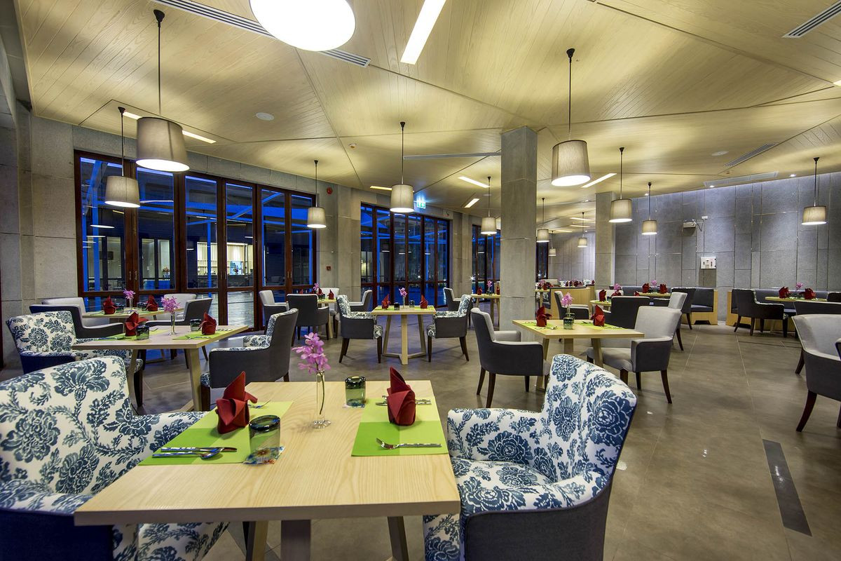 Состоит из двенадцати главных 3-5-этажных зданий с лифтами и двадцати двух 1-2-этажных вилл. Взимается депозит.