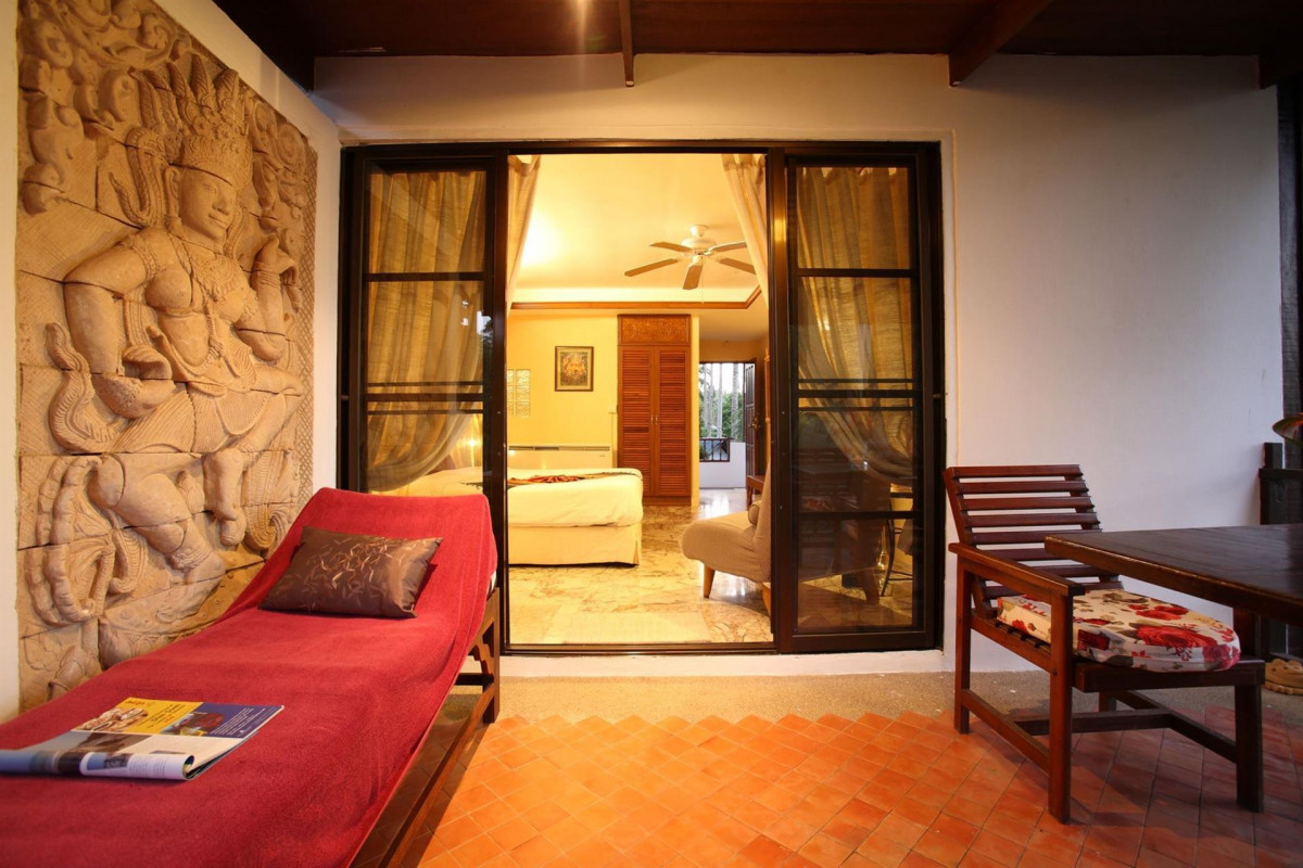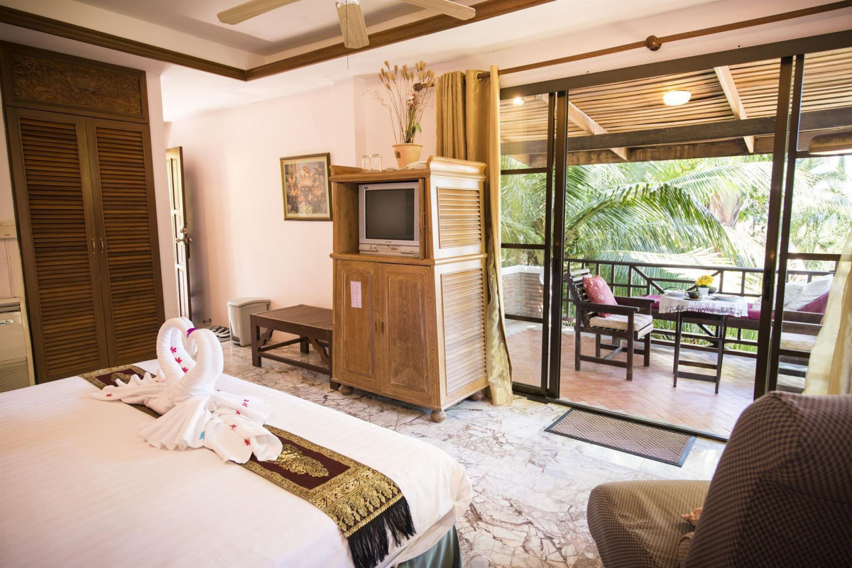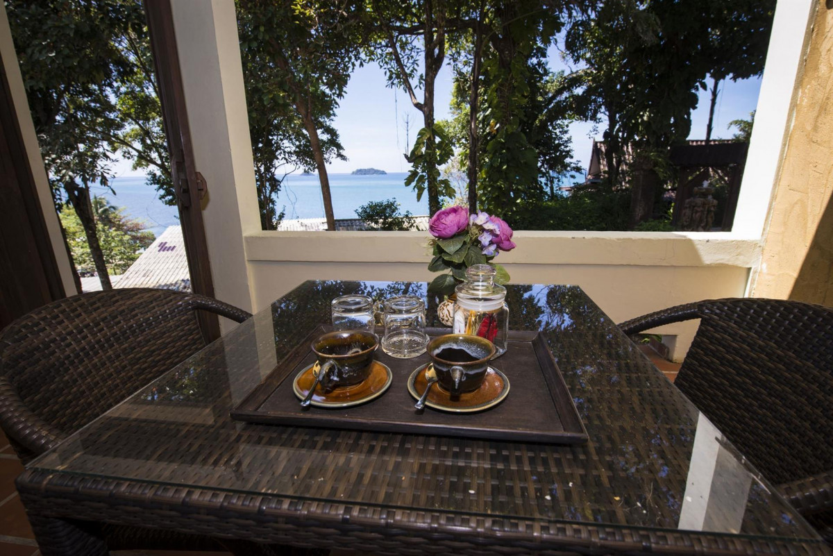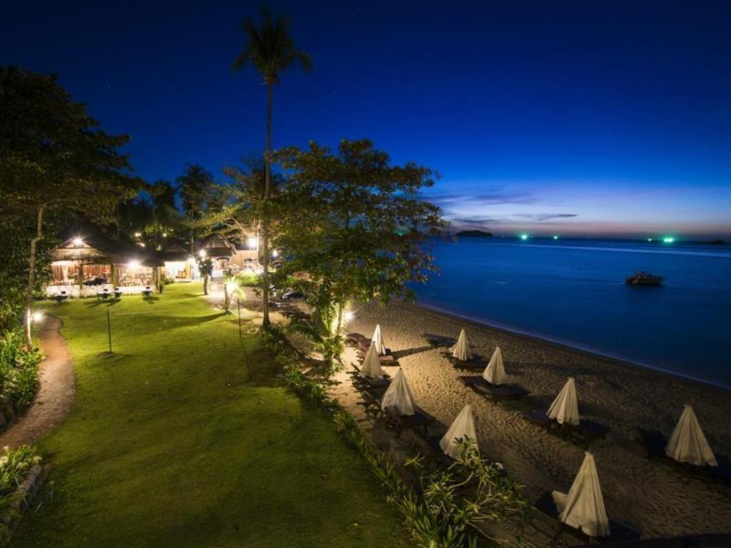 На западном берегу острова, на пляже Kai Bae Beach, на берегу моря. От пирса острова до отеля 15 минут.