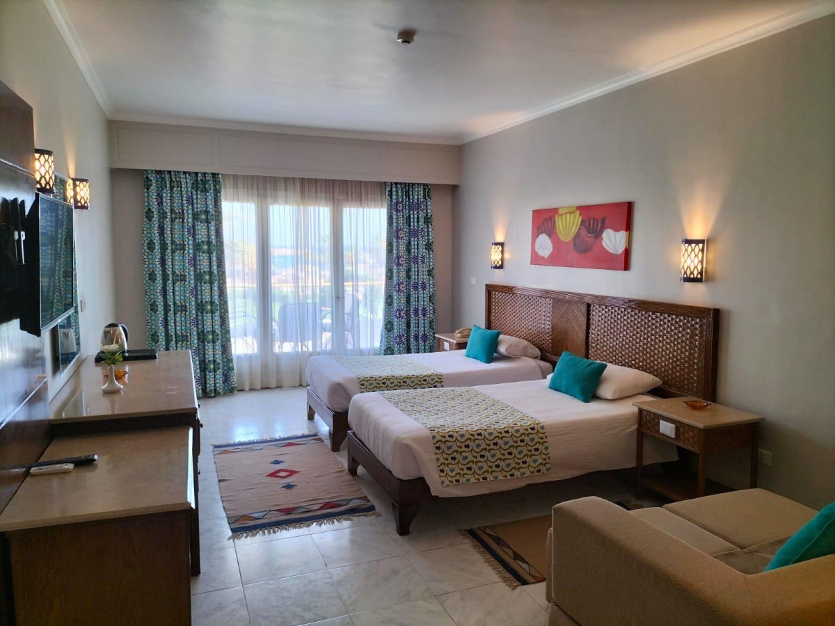 Отдыхала в данном отеле с конца января и захватила февраль 2025 г. Очень приятный отель! Прекрасная территория, хорошие номера, отзывчивый персонал, в ресторане всё вкусно, хотя выбор небольшой и нет свободного доступа к блюдам. Видимо, всё с времён covid-19 Стеклянное ограждение по всей линии раздачи и стоят повара, которые с уважением положат на вашу тарелочку, всё, что вашей душеньке приглянулось. Лично мне это понравилось. Не увидела туристов с горой еды на тарелке и после , с той же горой несъеденного- прекрасно!!!. Русских в отеле почти нет, в основном поляки, немцы, англичане, присутствуют местные семьи , в основном женским составом с малышами, без мужчин. Европейцы там всю зиму проживают. Возраст отдыхающих от 40 плюс, если молодежь есть, то с малыми детками, потому что шикарный песчаный пляж, пологий заход в море и никаких " гадов" у берега, красивейшая цветущая территория, ухоженная. Анимационная команда в отеле присутствует, но отдыхающие " мёртвые" какие- то! Ну, на стейтчинг придут женщины и всё, ни на танцы, ни на волейбол, боччу , ни на вечерние шоу - НИ-КО-ГО, кроме русских или русскоязычных иностранцев!!! Просто бухают в баре на пляже с утра до закрытия. Бар на пляже отличный! Приятная обстановка, море буквально под ногами, доброжелательный персонал- замечательно. После ужина в отеле тихо. За пределами отеля есть променад, магазинчики, клубов и дискотек- нет. Аниматоры вывозят за деньги в Хургаду. Отель рекомендую для спокойного отдыха парой, компашкой или с детками.