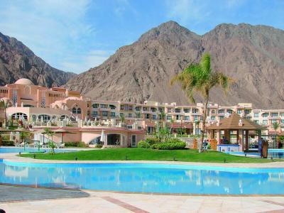 В 220 км от аэропорта Шарм-эль-Шейх, в курортной зоне Таба, на самом берегу моря.