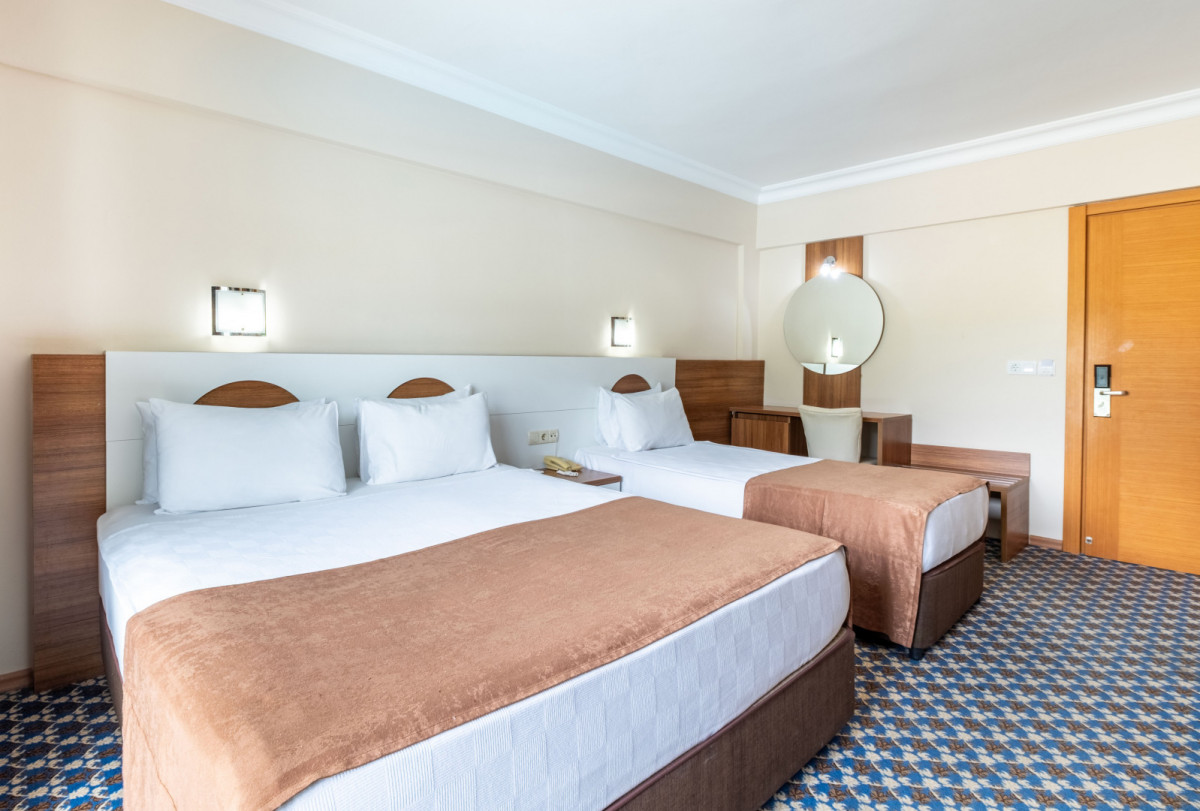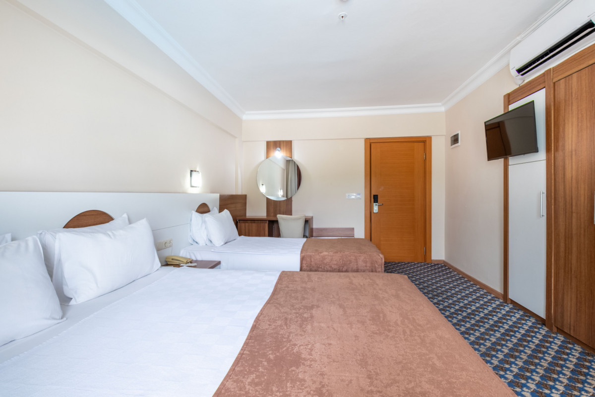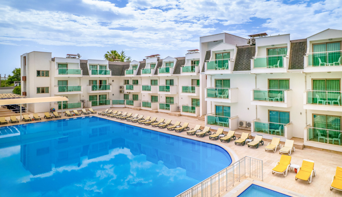 Отдыхали в первых числах октября. Отель на наш взгляд на 3 с плюсом. Расположен в поселке.Трехэтажные небольшие здания и отдельно стоящая столовая. убираются, моют. Территория ухоженная. На ресепшен русскоговорящий персонал. Вай-фай в лобби бесплатный. На остальной территории за доп плату. В номере старая сантехника, течет, пол в ванной из-за этого сырой. На полу ковролин, думаю, его только пылесосят и он давно хотел бы помыться. Еда очень скудная и однообразная. Мяса мало. Потроха, курица (не каждый день), один раз была рыба (скумбрия). Овощи тушеные и нарезанные. Выпечки нет, десерты невкусные. На завтрак только яйца. Жареные и вареные. Мужчины и дети, наверняка, оставались голодными. Из напитков только чай (заверенный в чайниках, выбора нет) и кофе (его я не пробовала). В перерыве между обедом и ужином у бассейна давали лепешки турецкие и картофель фри. На пляж лучше приходить пораньше. Идти нужно мимо торговых лавок минут 10. Территория пляжа у отеля маленькая. Лежаков не хватает, поэтому кто не успел, тот лежит на песке. На пляже имеется будка, там предлагают пиво, воду и напитки типа юпи. Заход в море каменистый. Вид на горы шикарный. Имеется пир у соседнего отеля. Туристов из других отелей выгоняют, но фото сделать можно. Гулять негде. Но можно уехать в Кемер или анталию. Рядом есть мигрос. Он небольшой. Но необходимое имеется. Евро берут, но сдача только в лирах.