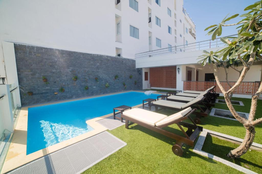 Всем привет! Отдыхали в этом отеле с 2-12 октября. Расположение отеля очень удачное, все рядом: кафе с демократичными ценами, магазин "Сапфир", где есть практически все необходимое, обменники. До пляжа 7-10 минут неторопливо. Завтраки неплохие, не Турция конечно, но голодными не останетесь, выбор есть. Номера нормальные, уборка ежедневная, насекомых в номере не видела. Кофе, чай, бутылка воды пополнялись ежедневно. Полотенца пляжные брали с вечера без проблем. Бассейн маленький, но нам хватало, потому что практически всегда никого не было. Номер был без балкона и без окна, но это специфика Вьетнама. Пляж городской, море чистое, шезлонги не брали, не было смысла. В общем отель вполне нормальный для 3***. Однозначно рекомендую.
