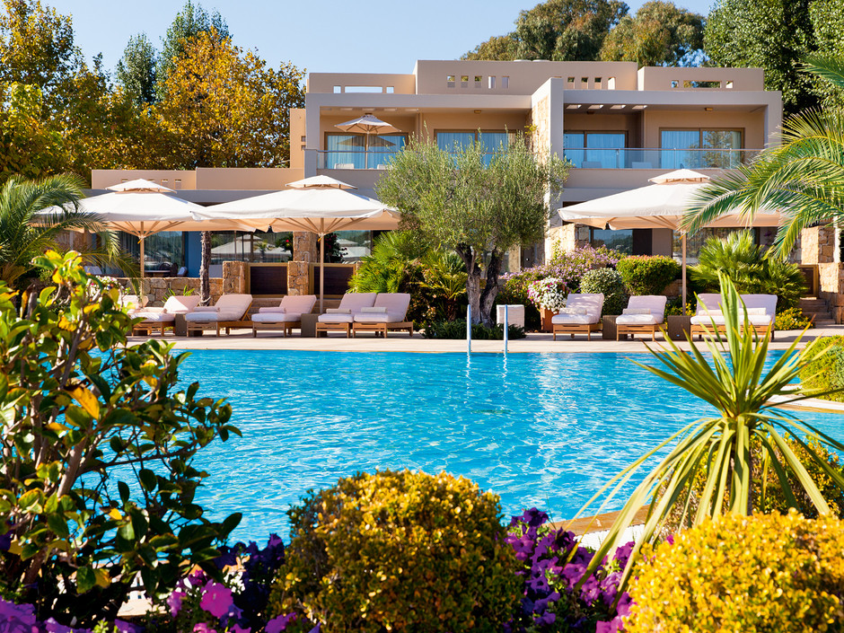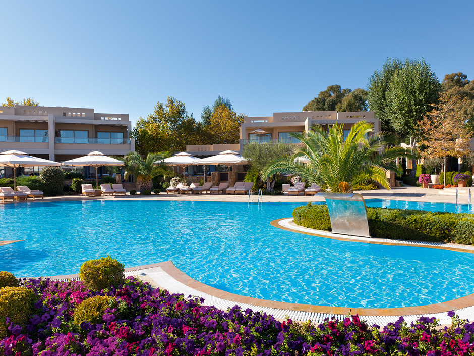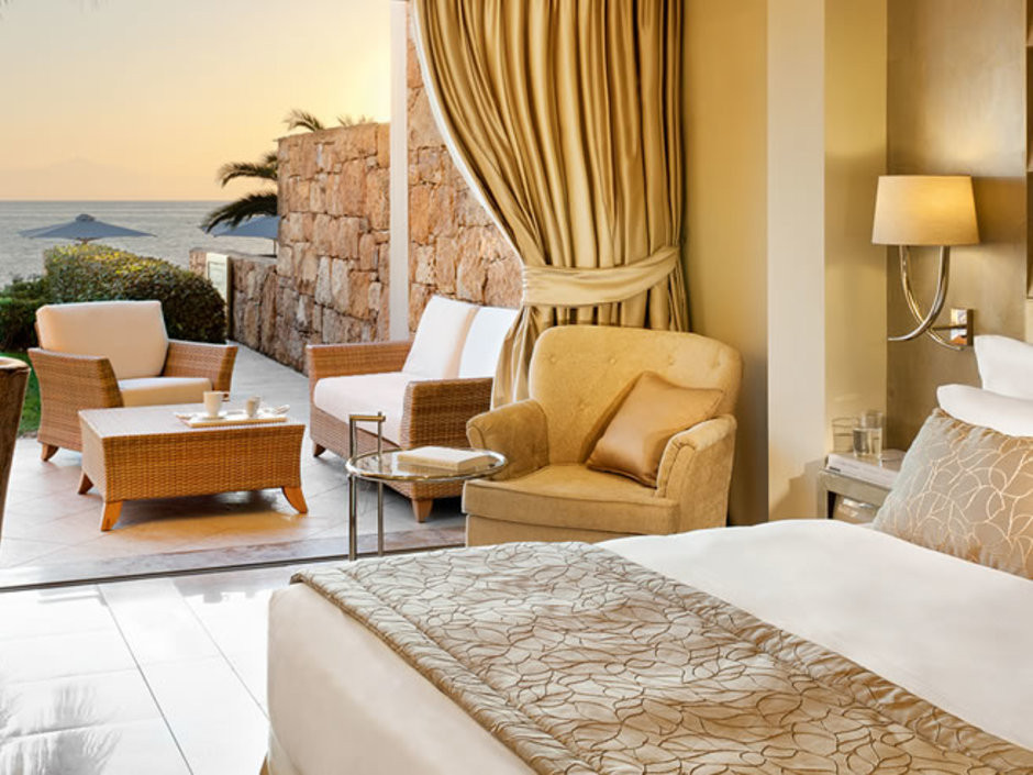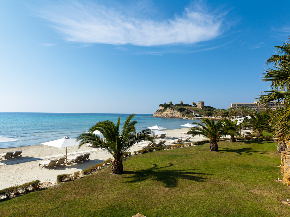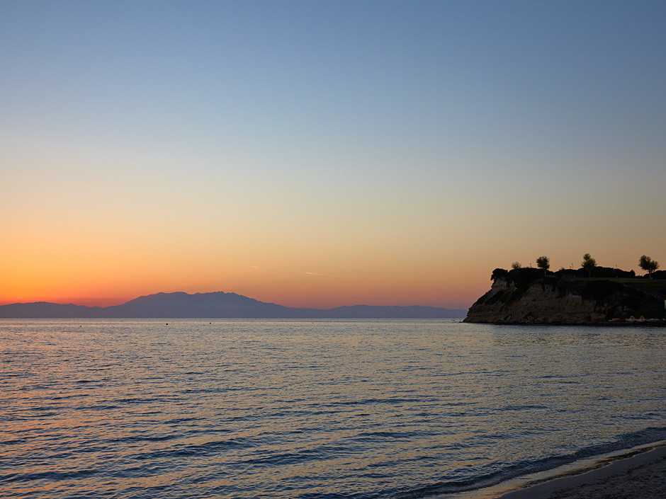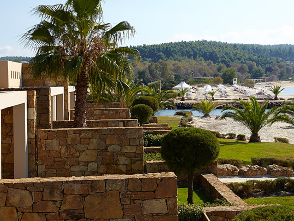 На западном побережье полуострова Кассандра, в 10 км от Неа-Фокиа, в 80 км от аэропорта г. Салоники, на берегу моря.