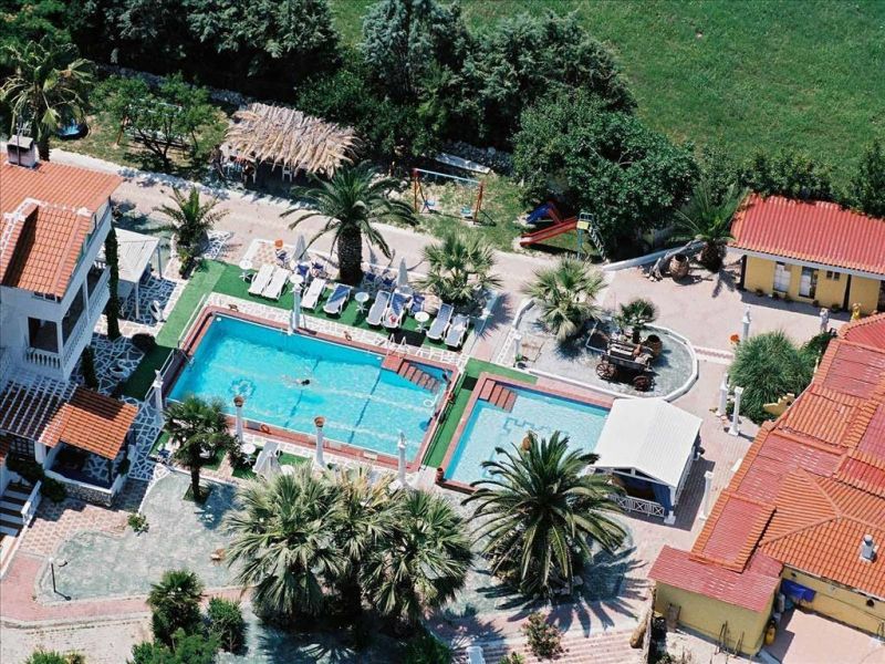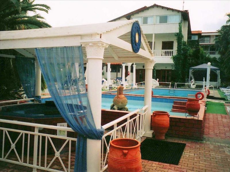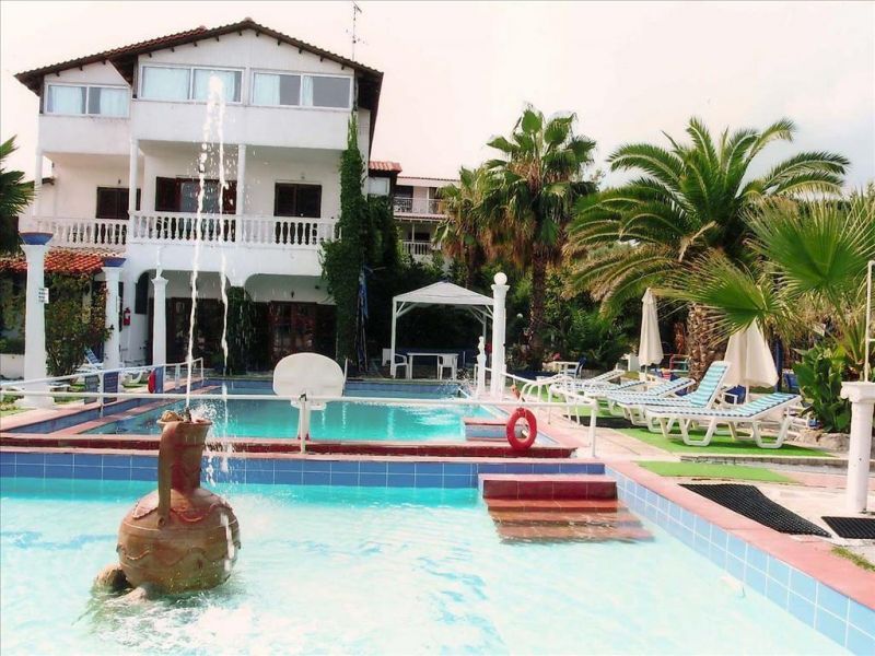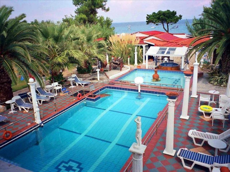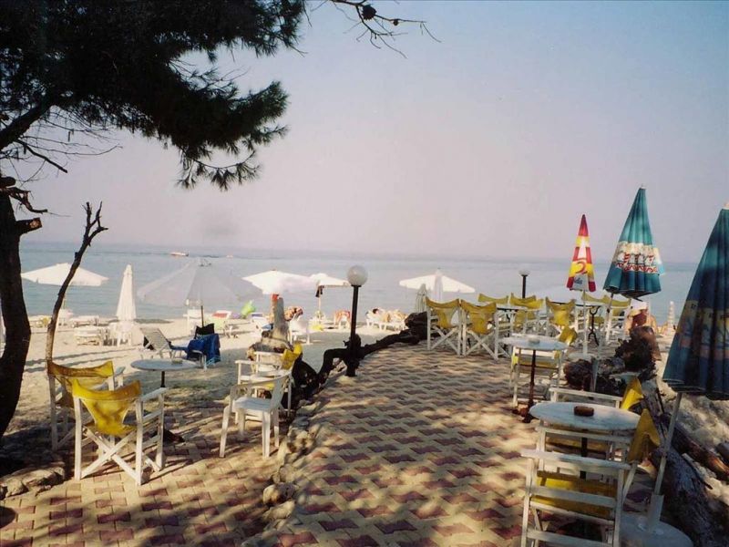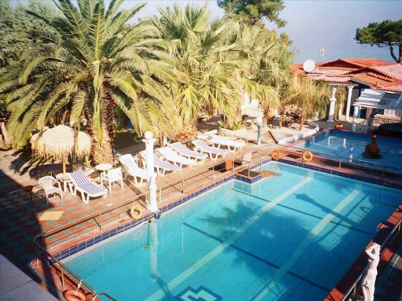 Песчано-галечный рядом с отелем. Лежаки и зонтики (платно).