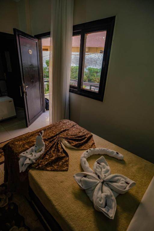 Это сарай, фото не соответствуют новое здание более менее э о медпункт почему то. Двери чёрные сатанисткие. Все очень убитое страшное. Я приехала плакала . На рецепции 5 негров татар говорят по русски такие страшные грубые. Номера маленькие плесень много черной мебели без вкуса ужасно. Не рекомендую никому. Стекла они вообще не моют это все в старой Хургаде где нищета.