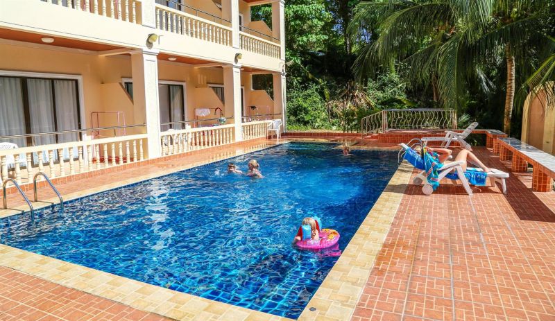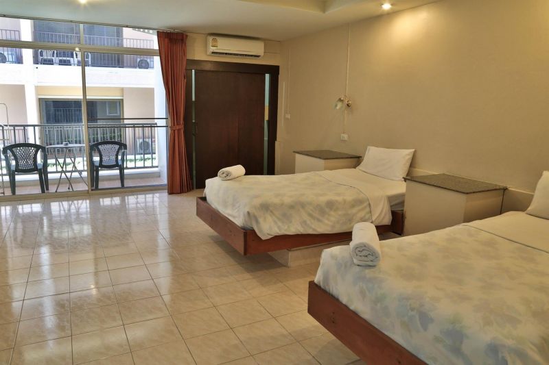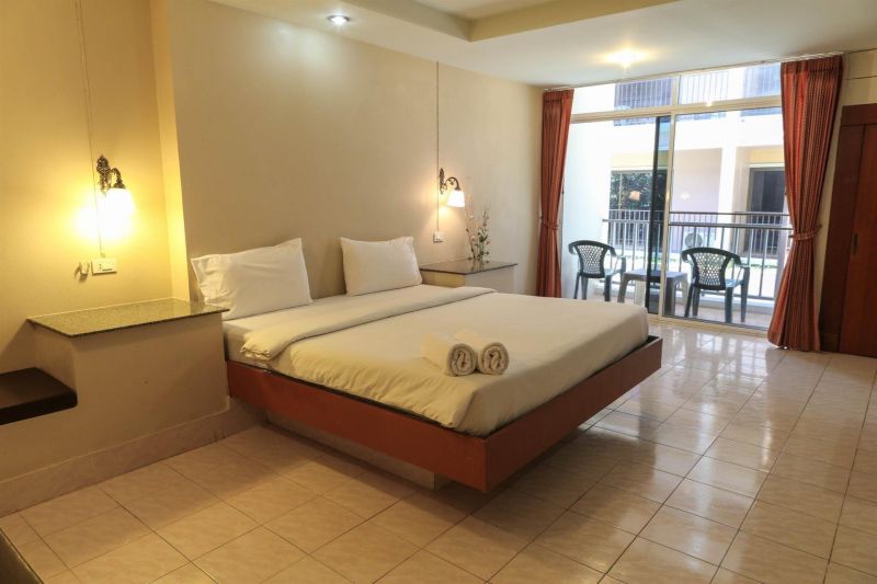 Добрый день! Отдыхали в этом отеле - номер понравился. Номер был на втором этаже прямо перед бассейном. В номере чисто, кондиционер, чайник, сейф, посуда (2 блюдца, 2 стакана, 2 кружки, 2 ложки), пляжных полотенец нет. Некоторые туристы говорят, что насекомые ходят по номеру - ничего такого не было! Пляж Карон в пяти минутах ходьбы от отеля, Ката минут 7-8, чаще ходили на Карон, потому что ближе. Бюджетный отель, нам понравился, у нас был не такой старый корпус D, самый первый корпус А говорят - не лучший. Завтрак с 7-10 утра, вкусный)