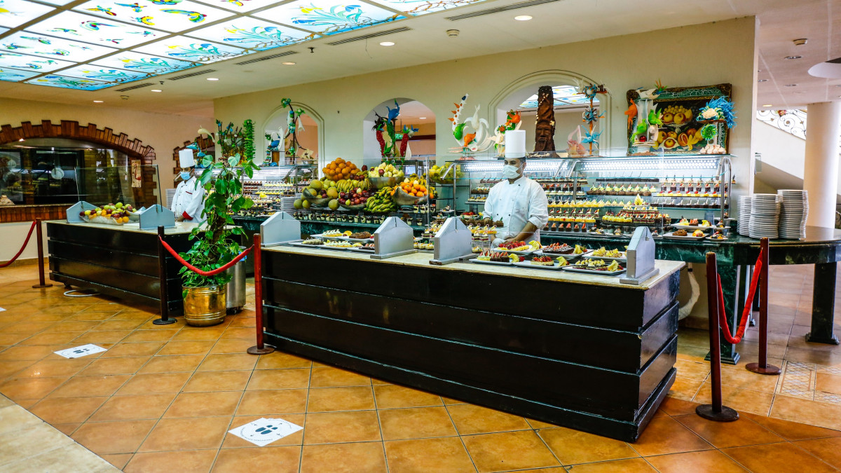 Ранний заезд. Кто будет заезжать после 10:00 - абзац можно пропустить. Мы приехали около 6:30, сказали за браслетами подойти в 11 (по факту оказалось в 10), кто хочет позавтракать – доплата 7$ (дети бесплатно, но детей без взрослых не пустят). На практике это означает, что в рамках AI до 10 часов вам не удастся даже попить, а поесть сможете только в 13:00. Может быть, с водой не всё так жёстко –когда приехали, сразу за входом стояли ёмкости с напитками –типа вода с гибикусом, лаймом и что-то ещё, но уже через неделю они из холла исчезли. Заселить тоже готовы были в 10, но «абы куда», чтобы выбрать что-то получше, пришлось подождать. Номера. Про ушатанность мебели и сантехники писали много, не буду повторять, мне было некритично. Кровати, подушки, бельё, полотенца –отличные. Техника и сантехника рабочие. Обратите внимание на выключатели –у меня они отключали весь блок розеток, а не только прикроватные светильники, так что можно случайно отключить холодильник. Вешалок-плечиков в шкафу было всего две, и они были без крючков, пришлось придумывать, как зацепить такие за верёвку, чтобы можно было сушить одежду. Я бы рекомендовал прихватить с собой одну-две копеечных вешалки (чтобы потом их оставить в номере), чтобы было удобнее. Кто-то жаловался, что если номер без балкона, то негде сушить вещи –я прихватил с собой бечёвку . Не понадобилась –верёвочка в санузле была. Лайфхак –круглое стандартное отельное мыло в обёртке прекрасно затыкает слив в раковине (если штатная затычка не работает или её нет, как у меня), если надо постирать или прополоскать вещи. Ёмкости с жидким мыло/гелями (одна у раковины и две в душевой кабине) были полные, все гели разных цветов и с разными запахами. Понравилось небольшое круглое зеркало с увеличением на суставной штанге в санузле, впервые такое увидел. Фен тоже был. Еда. Тут часто высказывают тезис –«голодными не останетесь». Я бы поднял планку и сказал по-другому – за 10 дней вам еда не надоест. Разнообразие хорошее. Особенно это касается вторых блюд – помимо четырёх-пяти видов рыбы/мяса, всегда есть одно-два блюда «мясо плюс гарнир» типа пасты с курицей или баклажанов с фаршем. Фрукты на десерт были дыня и финики –всегда, виноград, яблоки, апельсины, бананы- временами. Много всякой выпечки и пирожных, но я их в отелях не ем, так что оценить не могу. Интересный момент с хлебом –там его целый стенд, но если вы возьмёте любой понравившийся батон, окажется, что это засушенный «выставочный экземпляр» (что не помешало одному иностранцу на моих глазах такой батон распилить). Свежий же хлеб в виде затянутых плёнкой лепёшек или булочек всегда стоит внизу на подносах. Завтрак –каши, овсяные хлопья, солоноватые творожные массы, йогурты, яйца в разных видах, оладьи, сосиски. Небольшой проблемой был поиск свободного стола, особенно на компанию 5 человек, но и с этим справлялись, особенно если подходить к началу периода кормёжки. А вообще официанты всегда готовы помочь с поиском места. Да, желательно блюда все взять заранее и потом из-за стола не отлучаться –чуть отошёл, приходишь, тарелки нет –официант посчитал, что ты уже закончил есть и тарелку утащил . Рестораны а-ля карт в целом не впечатляют – еда примерно та же самая, что и в основном ресторане, просто вам её приносит официант, а бармен подливает вино. Восточный и рыбный –на террасе над морем (д