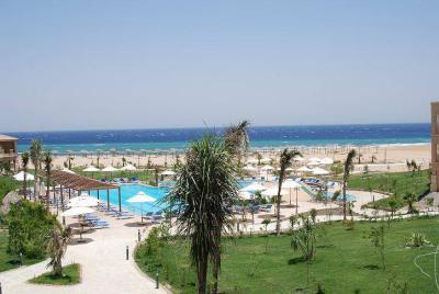 В 195 км от аэропорта Шарм-эль-Шейха, в курортной зоне Таба, на самом берегу моря.