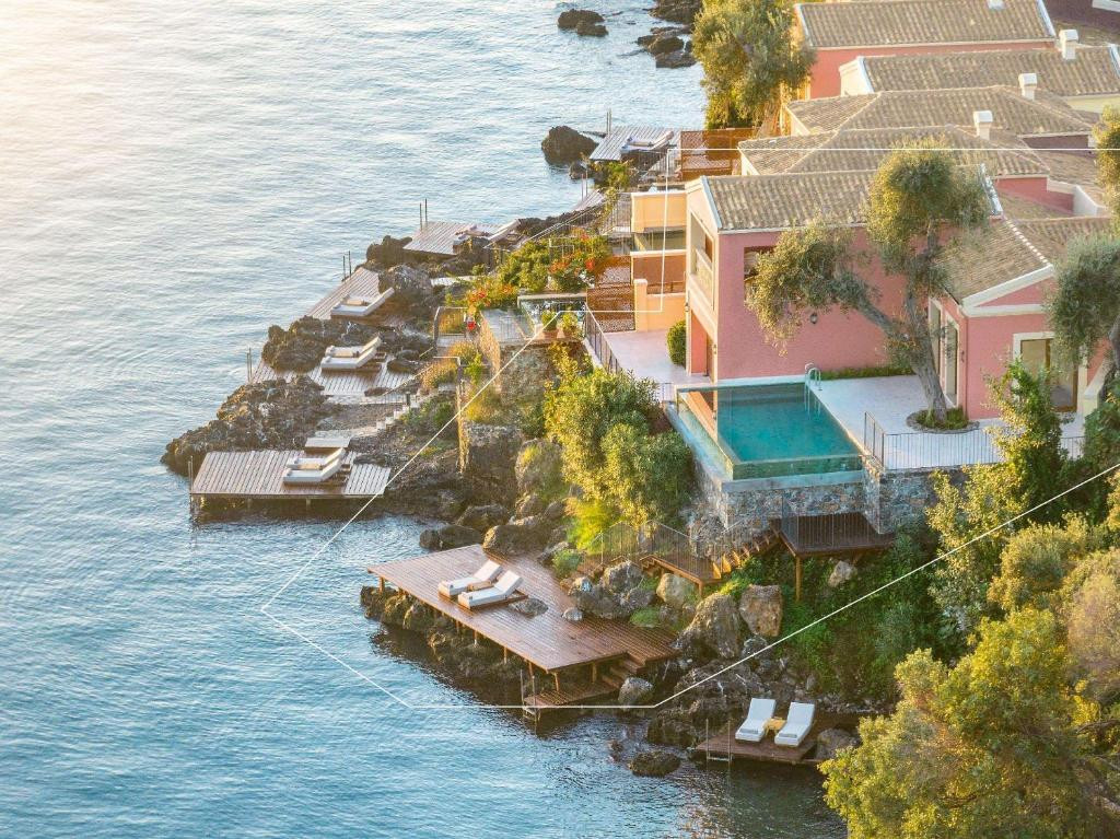 - 2 Bedroom Villa WF Pr. Pool and Pr. Beach (реновированы в 2022 г., прямой вид на море, город Крфу, пристань, прямой доступ к морю и индивидуальному пляжу, на нижнем этаже, гостиная и 2 спальни, 2 двуспальные кровати, 2 ванные комнаты, индивидуальный бассейн до 44 кв м, макс. 4 чел.+инфант, внутри 120 кв м, снаружи 70-210 кв м)