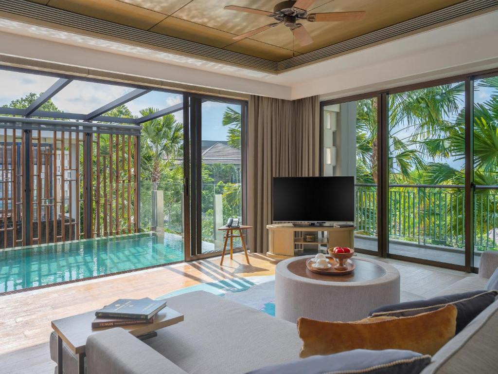 Jimbaran Pool Suite — 108 кв. м, частный бассейн, балкон, вид на залив Джимбаран и бассейн, кровать king, гостиная зона, макс. 3 взр. или 2 взр. + 2 реб.