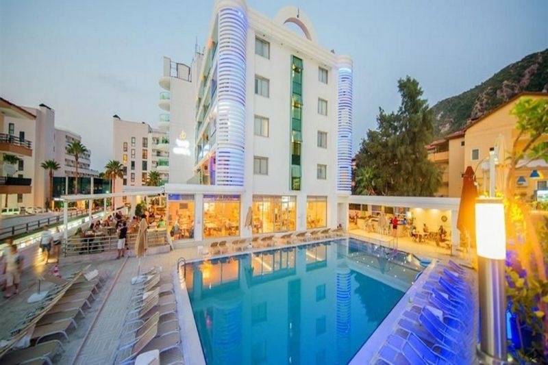 В 110 км от аэропорта г. Даламан, в 10 км от г. Мармарис, в центре поселка Ичмелер.